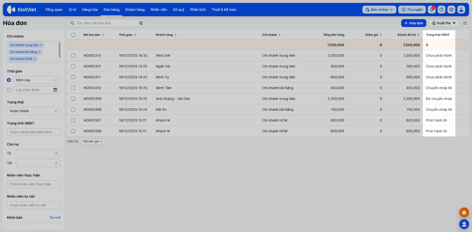 - Theo dõi trạng thái: Trên danh sách tại Giao dịch → Hóa đơn, KiotViet có thêm cột Trạng thái HĐĐT để bạn theo dõi tình trạng (Chưa phát hành, Đã phát hành, Phát hành lỗi, Đang xử lý, Đã chuyển nháp, Chuyển nháp lỗi)