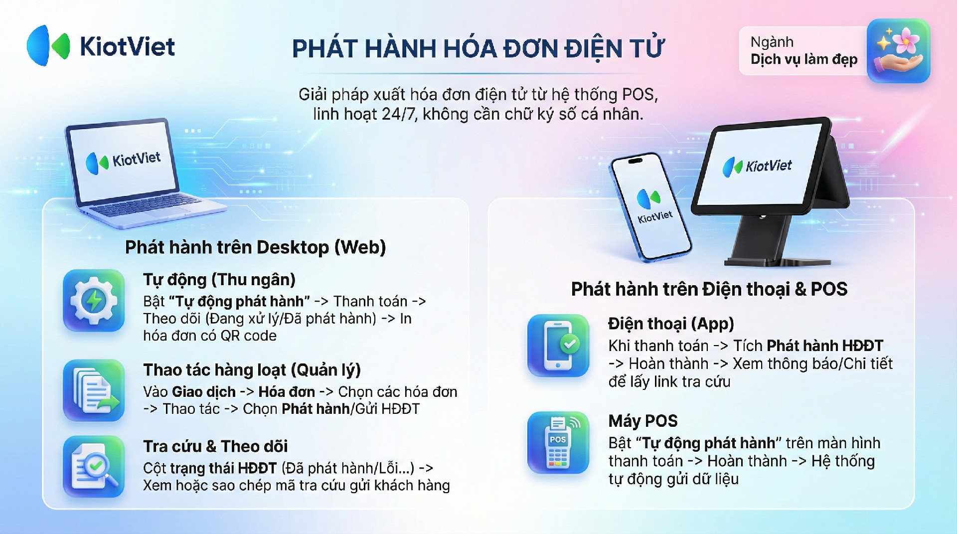 Tính năng Phát hành Hóa đơn điện tử trên KiotViet Salon POS hỗ trợ cửa hàng thực hiện các thao tác phát hành tự động ngay khi hoàn thành hóa đơn.