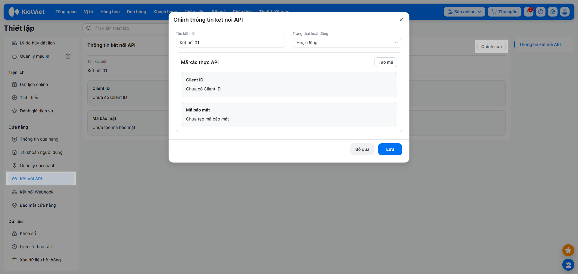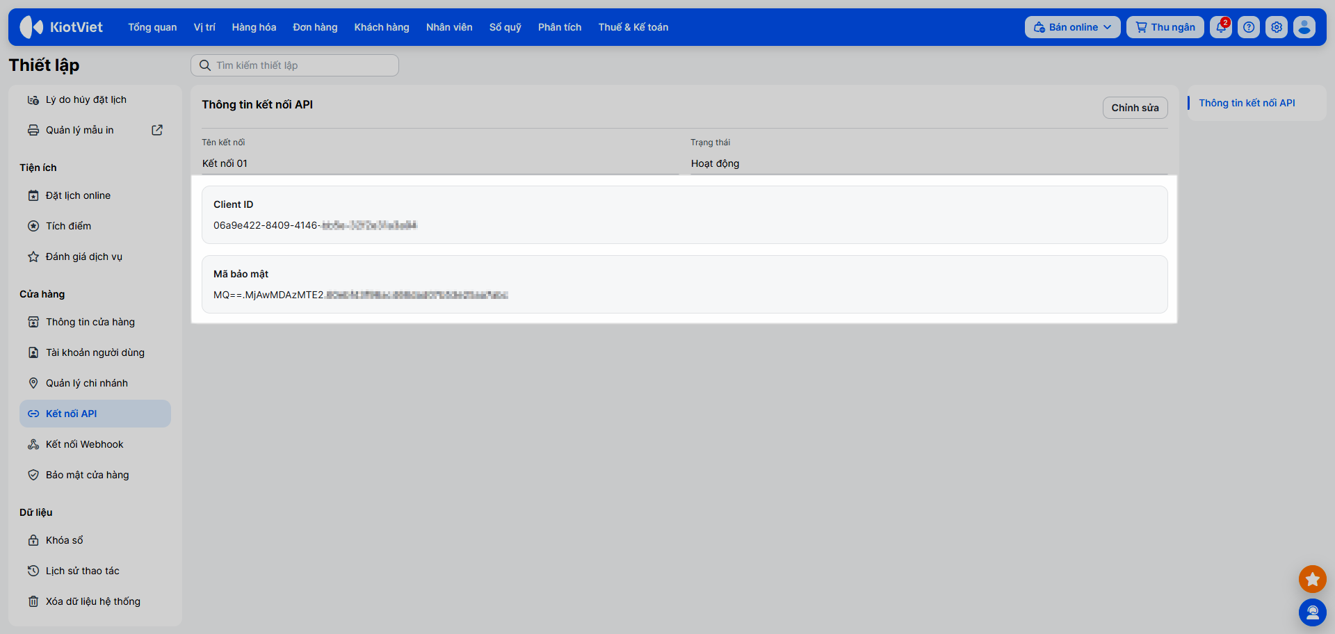 – Kiotviet API xác thực dựa trên cơ chế sử dụng client_secret đã được mã hóa. Để kết nối được hệ thống cần phải có thông tin Mã bảo mật. Thông tin này được truy cập vào mục Thiết lập cửa hàng bằng tài khoản admin → chọn Kết nối API.
