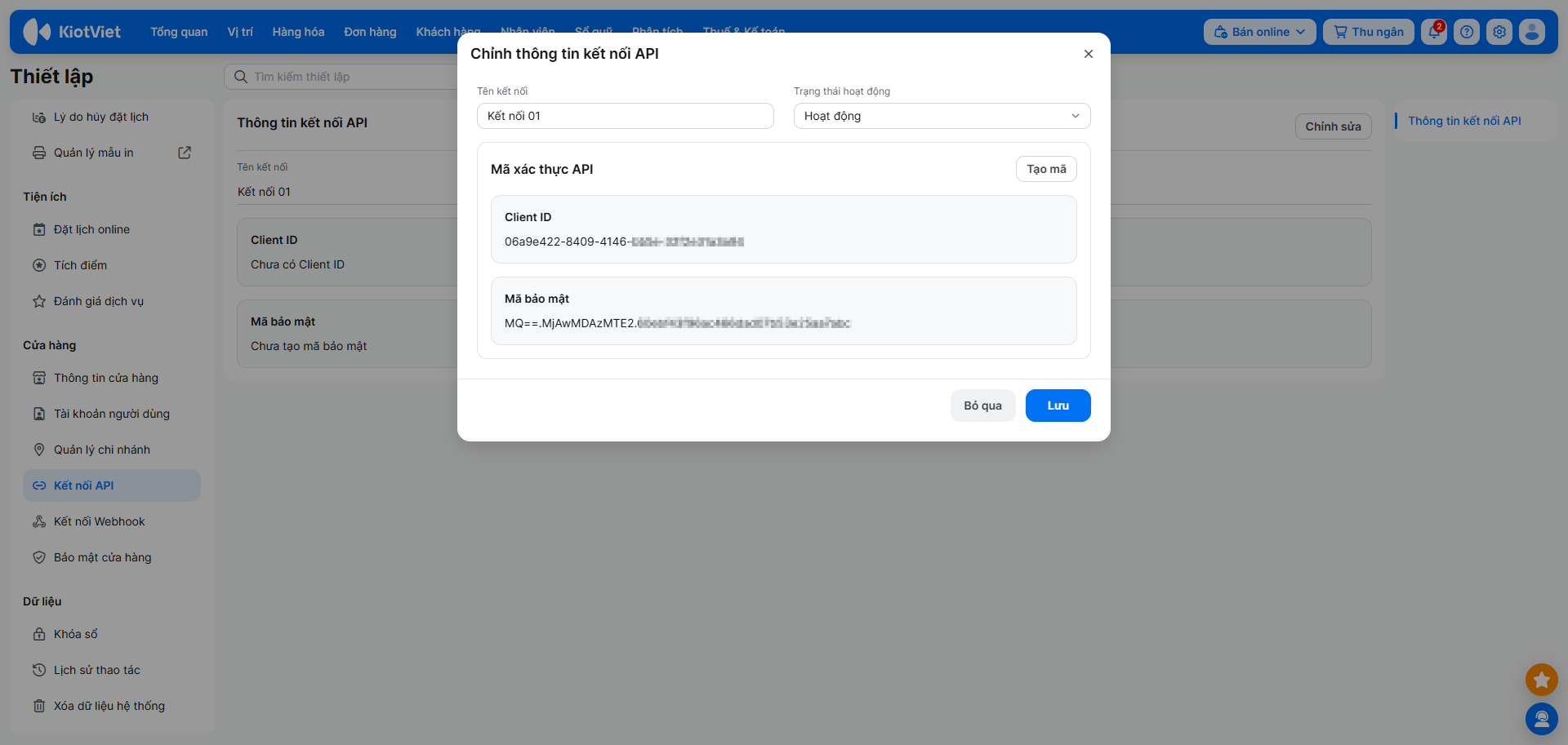 – Kiotviet API xác thực dựa trên cơ chế sử dụng client_secret đã được mã hóa. Để kết nối được hệ thống cần phải có thông tin Mã bảo mật.