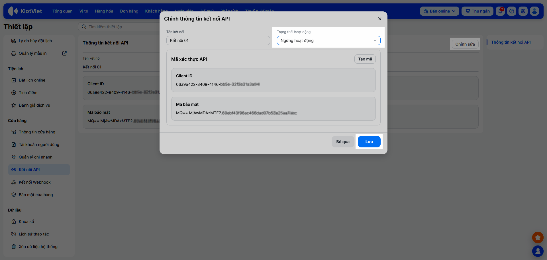 – Để ngừng hoạt động kết nối API, bạn nhấn Chỉnh sửa → chọn Trạng thái Ngừng hoạt động → nhấn Lưu để hoàn tất.
