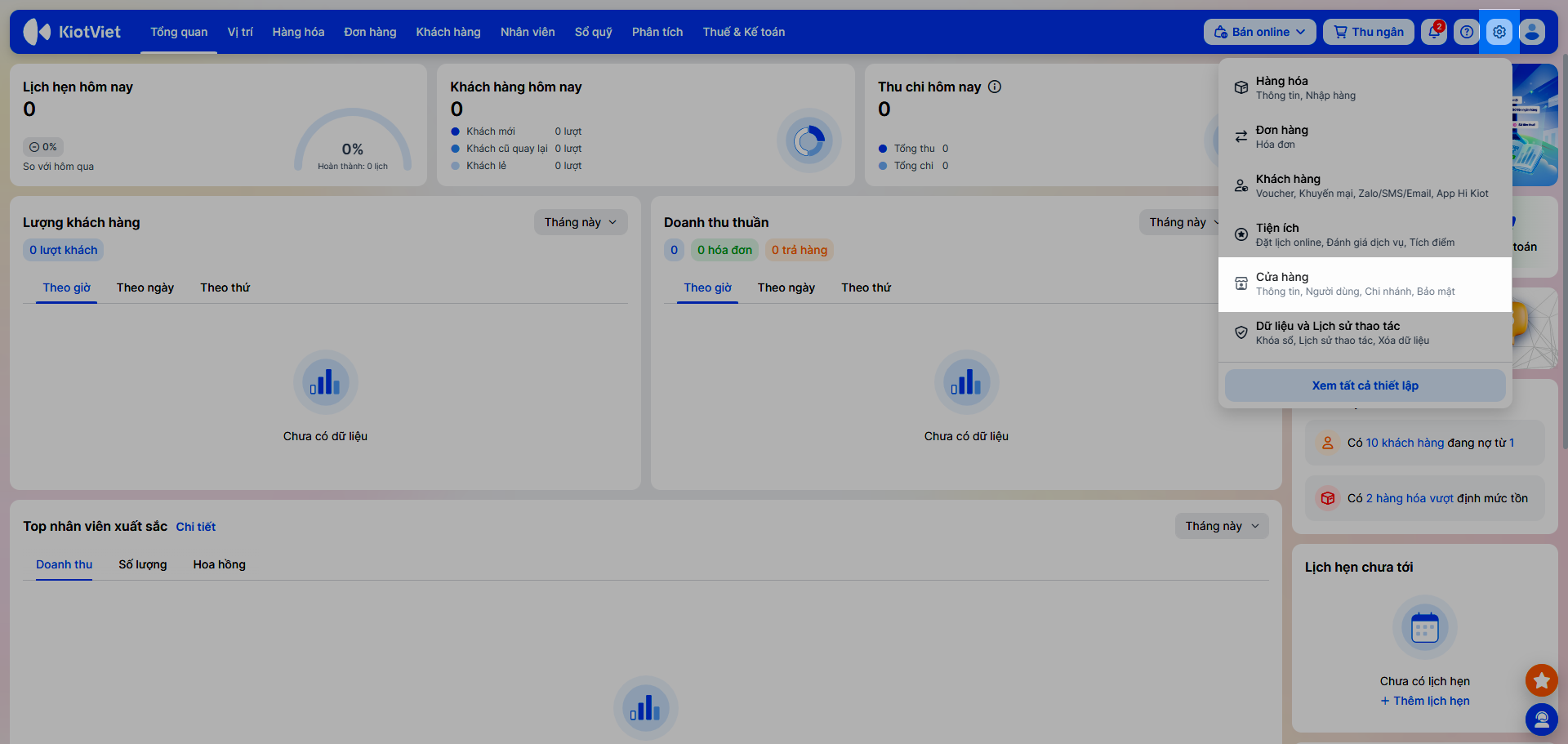 – Trên màn hình Quản lý, từ menu Thiết lập, bạn chọn Cửa hàng.