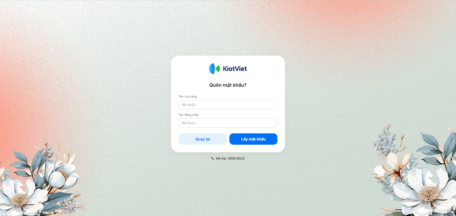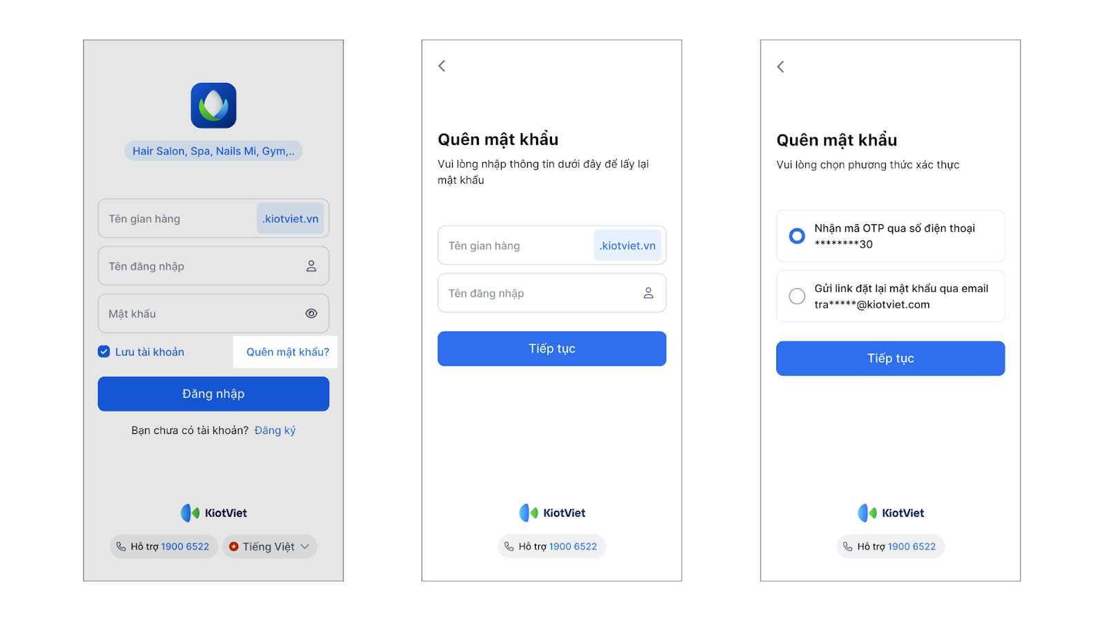 - Tình huống: Chủ gian hàng hoặc nhân viên quên mật khẩu khi đăng nhập trên ứng dụng KiotViet Salon.
