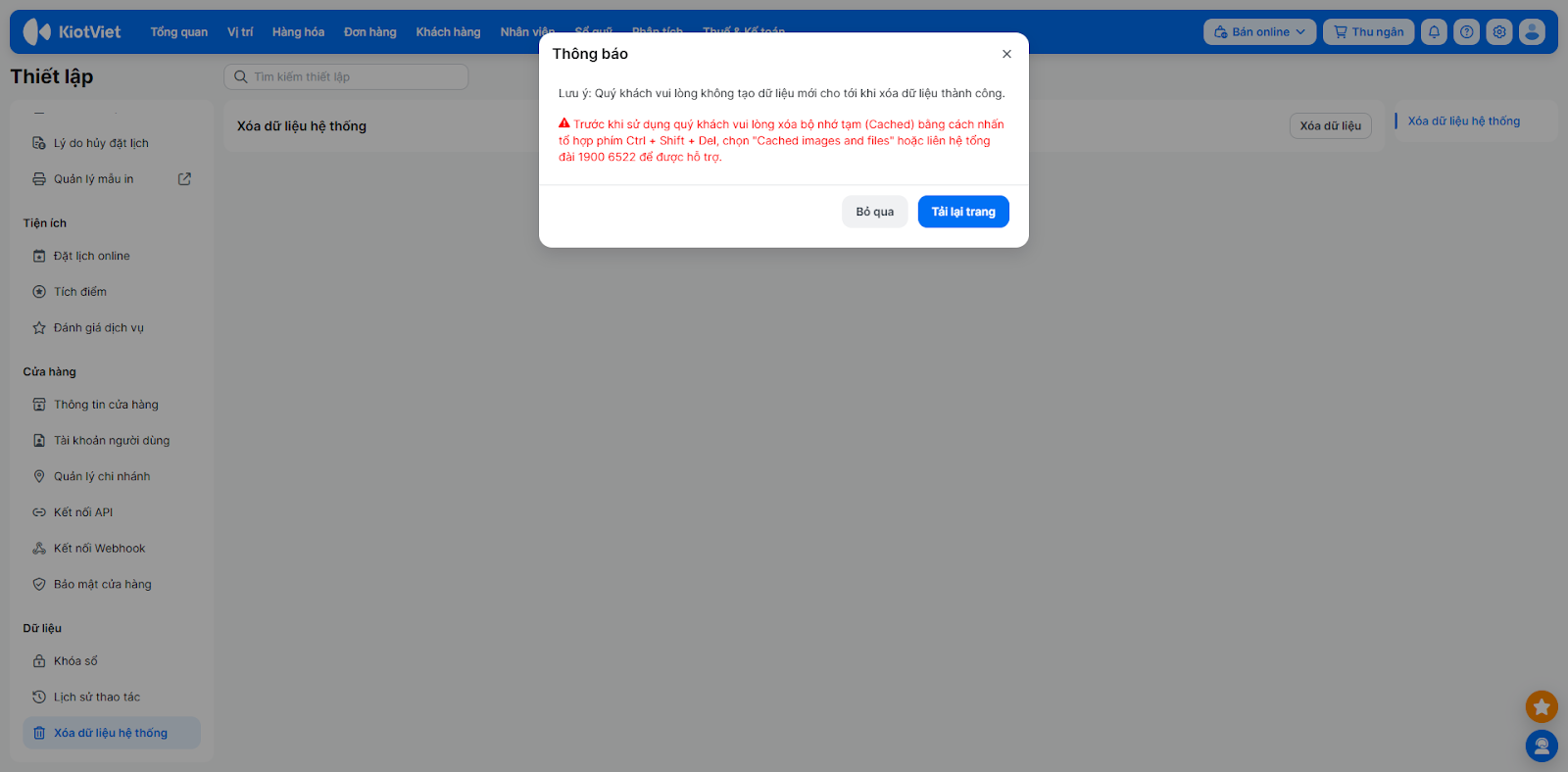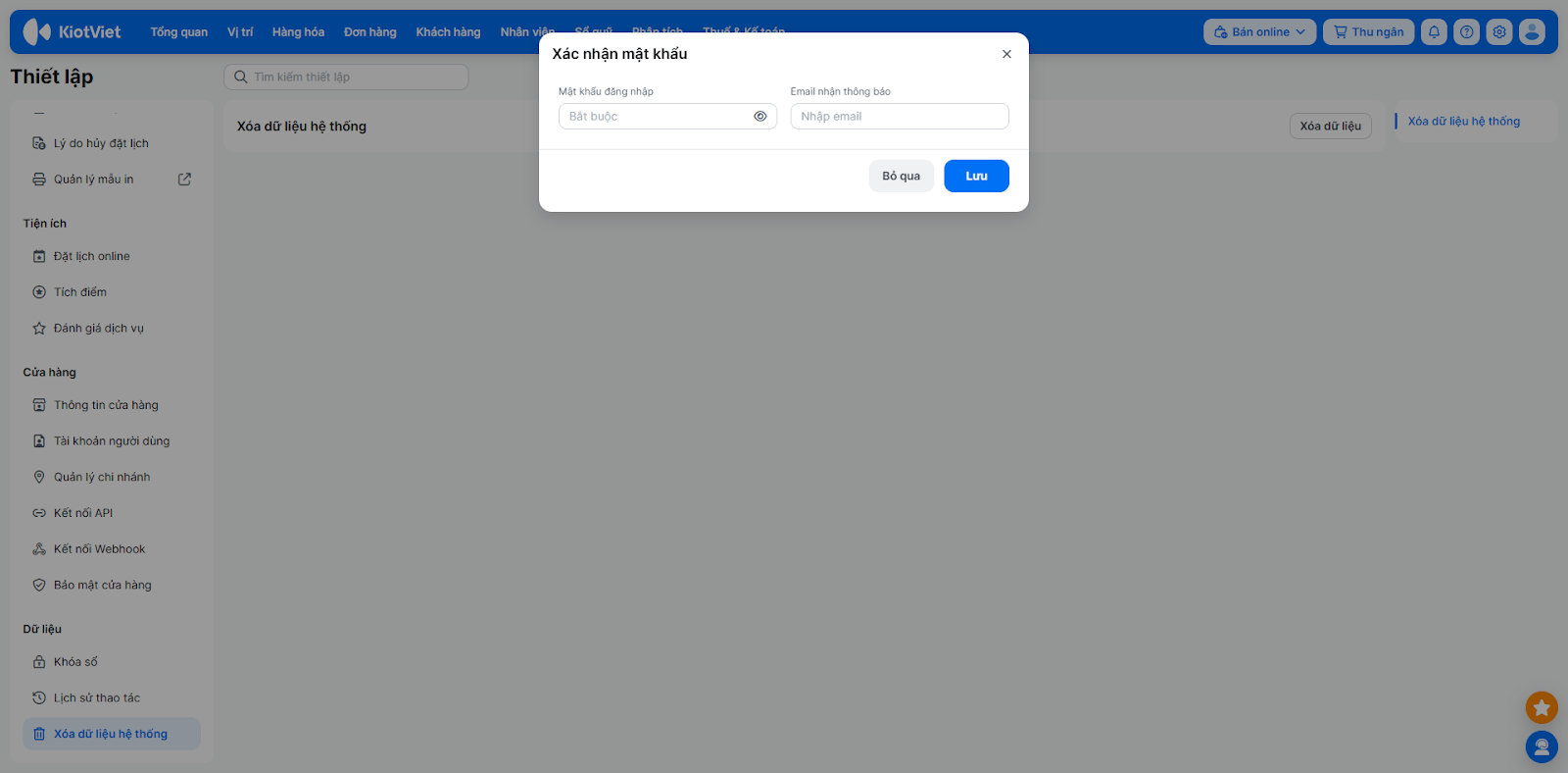- Chọn Xóa dữ liệu hệ thống → nhấn Xóa dữ liệu → Xóa.