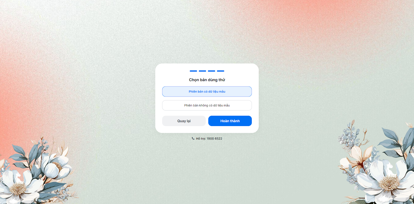 - Chọn Phiên bản có dữ liệu mẫu → nhấn Hoàn thành. Hệ thống sẽ khởi tạo dữ liệu giả định (Khách hàng, Dịch vụ, Nhân viên, Hóa đơn…) để bạn trải nghiệm.