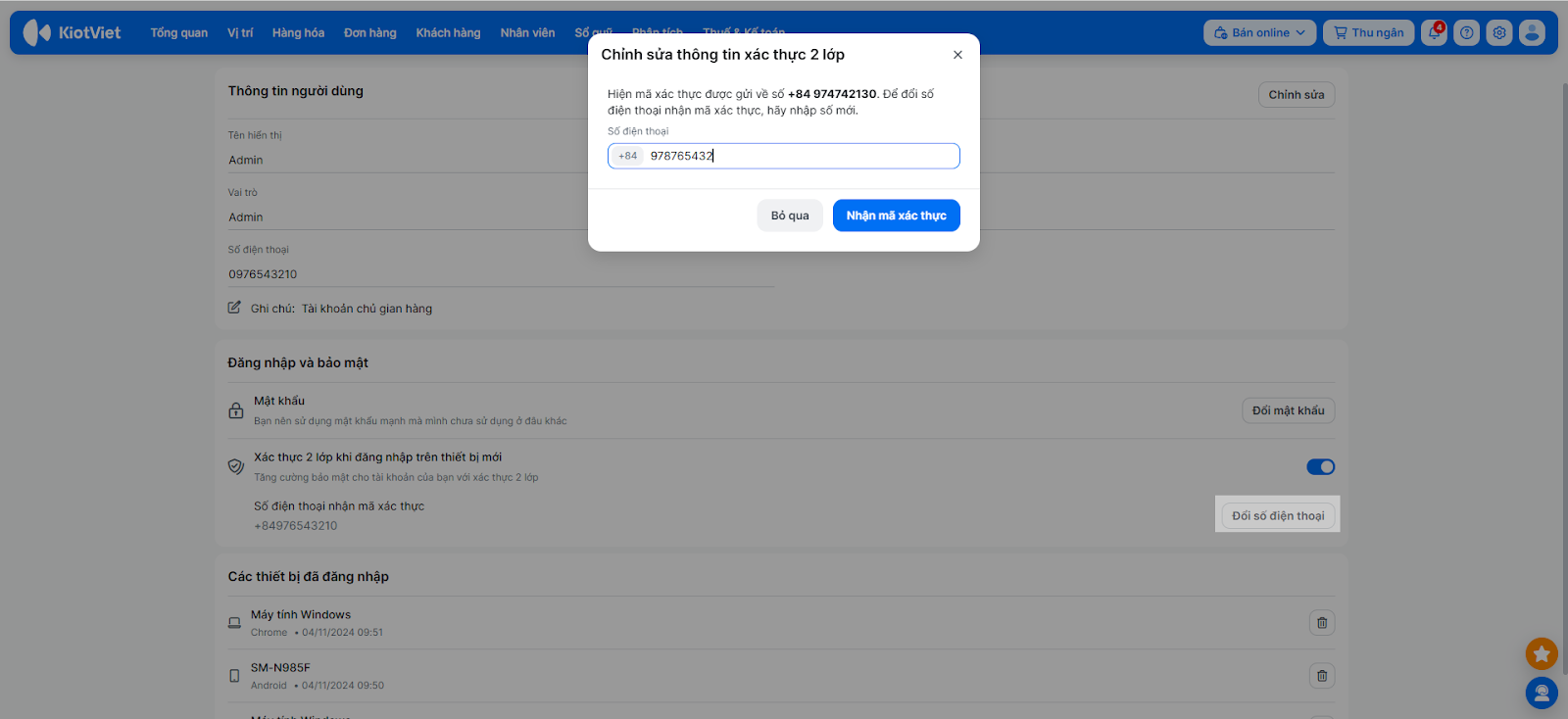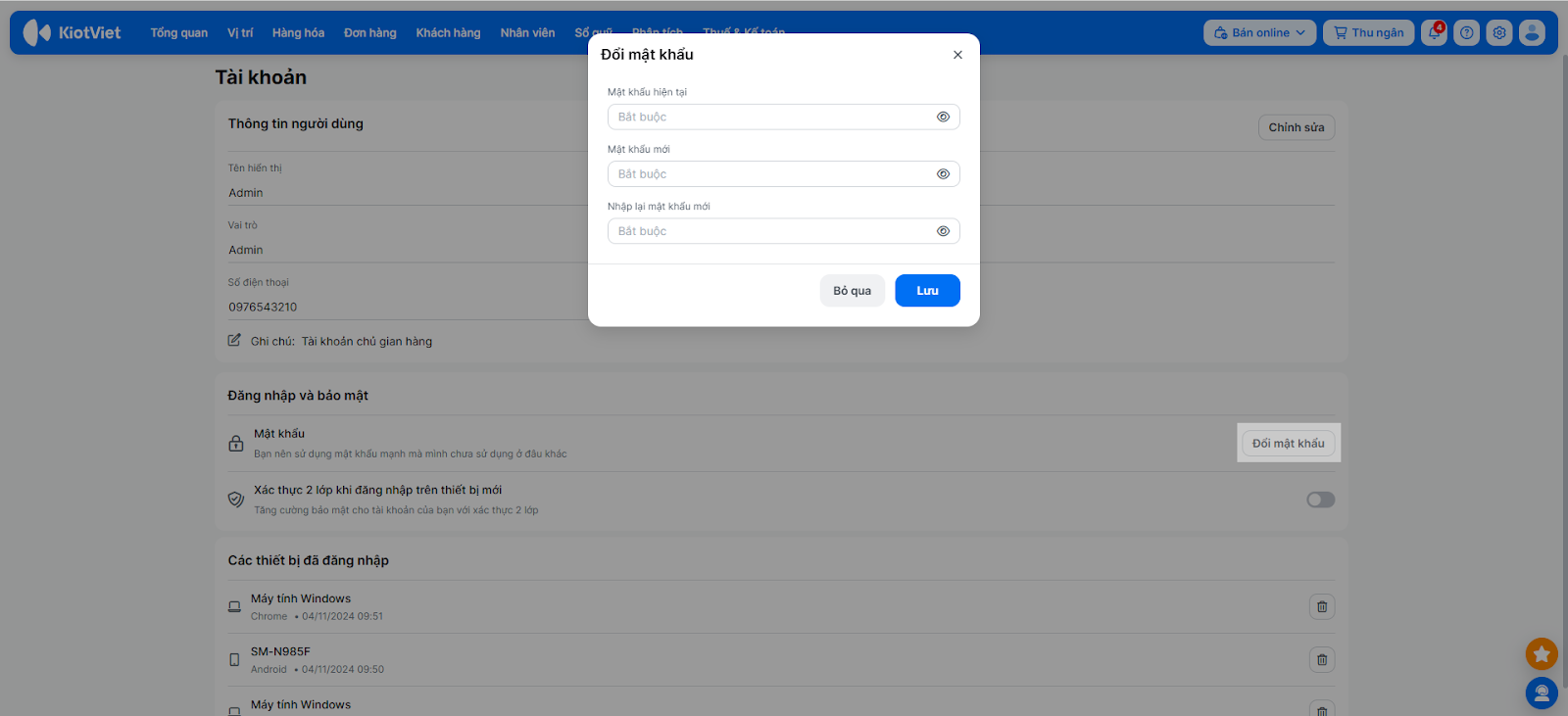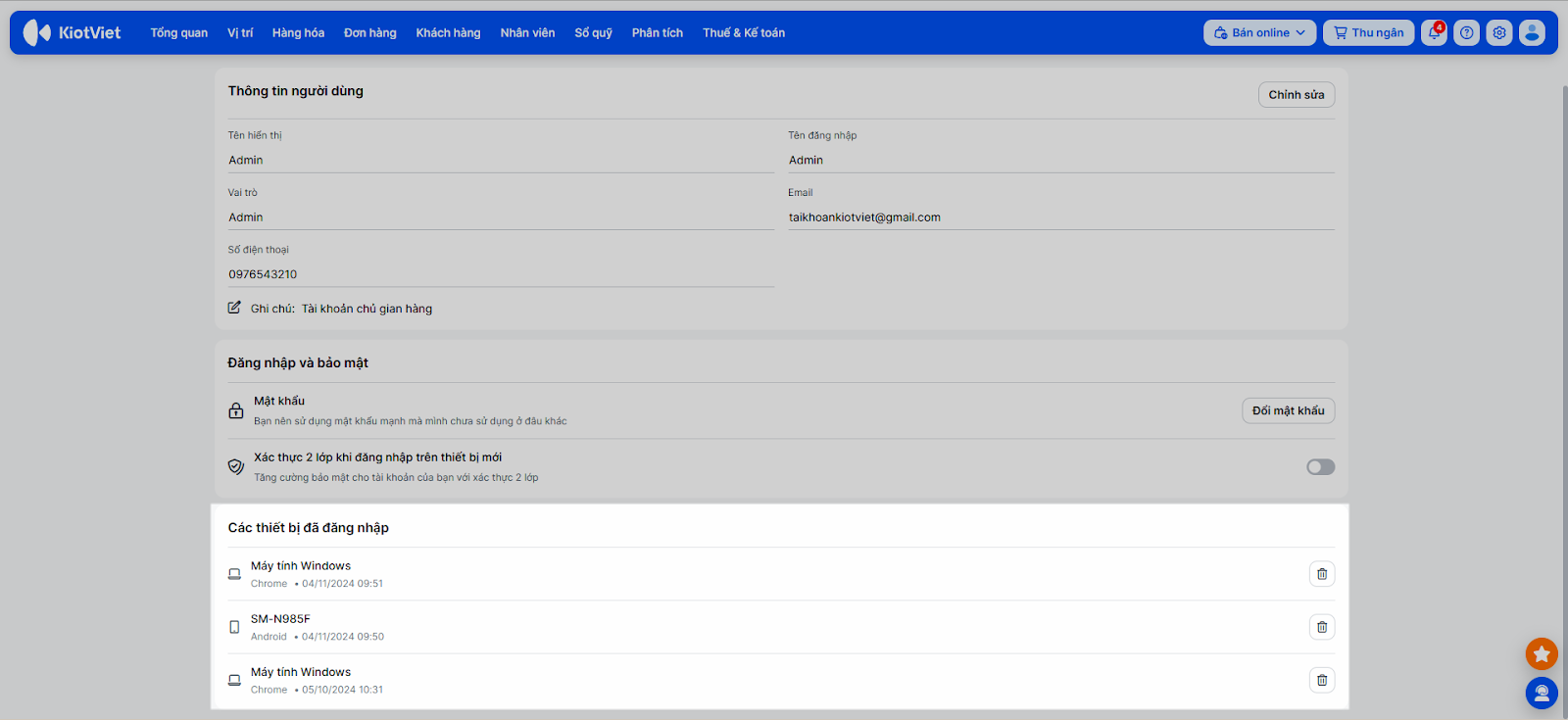 - Đối với tài khoản chủ gian hàng (Admin), bạn có thể xem thêm danh sách Các thiết bị đã đăng nhập để kiểm soát quyền truy cập.