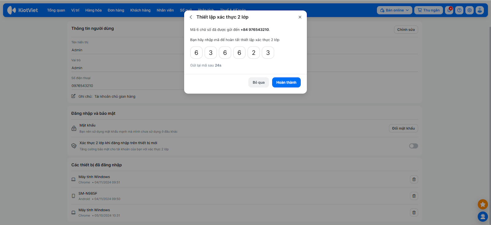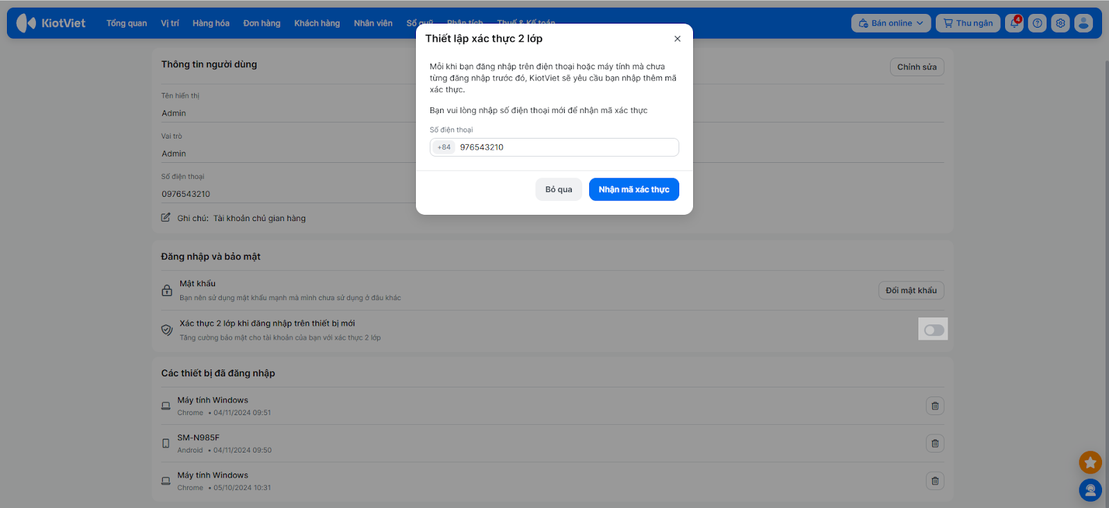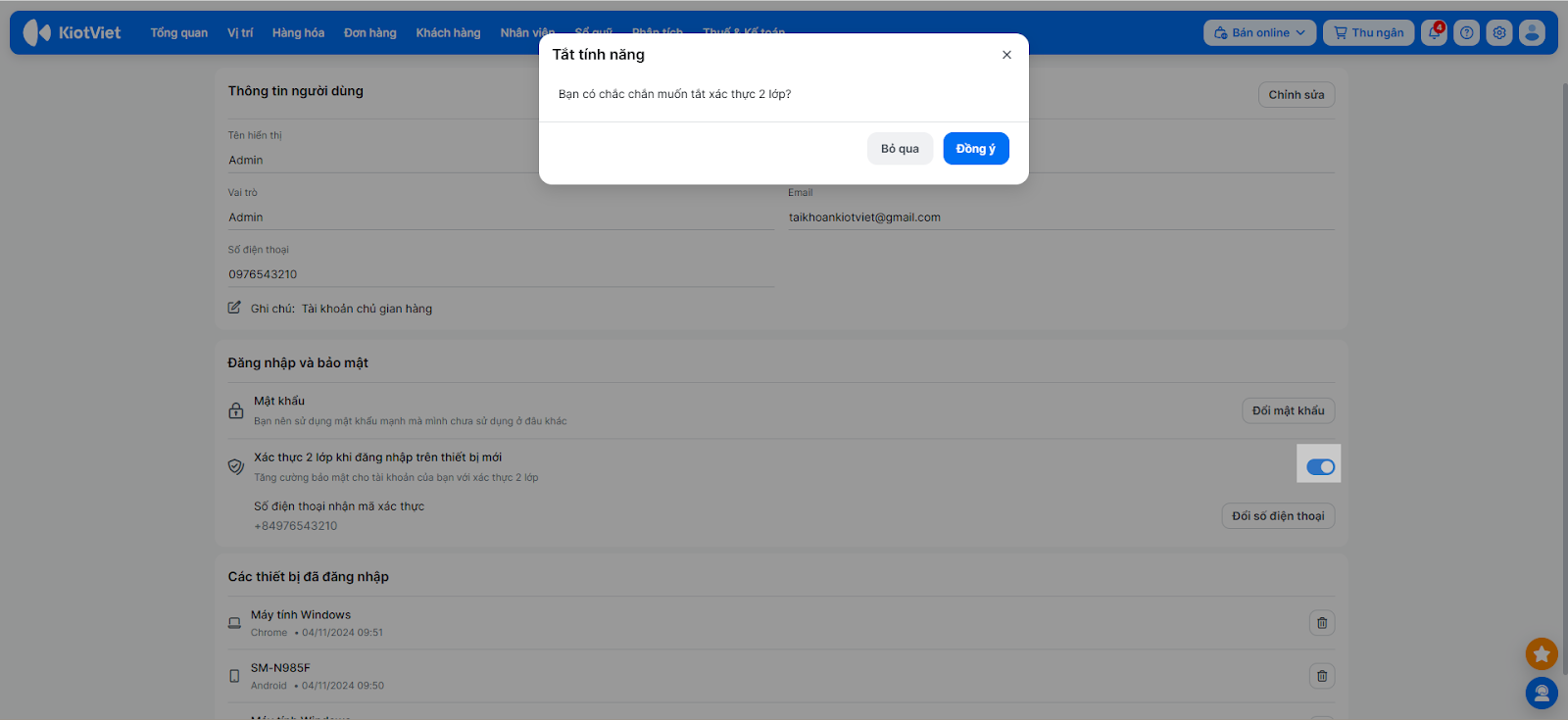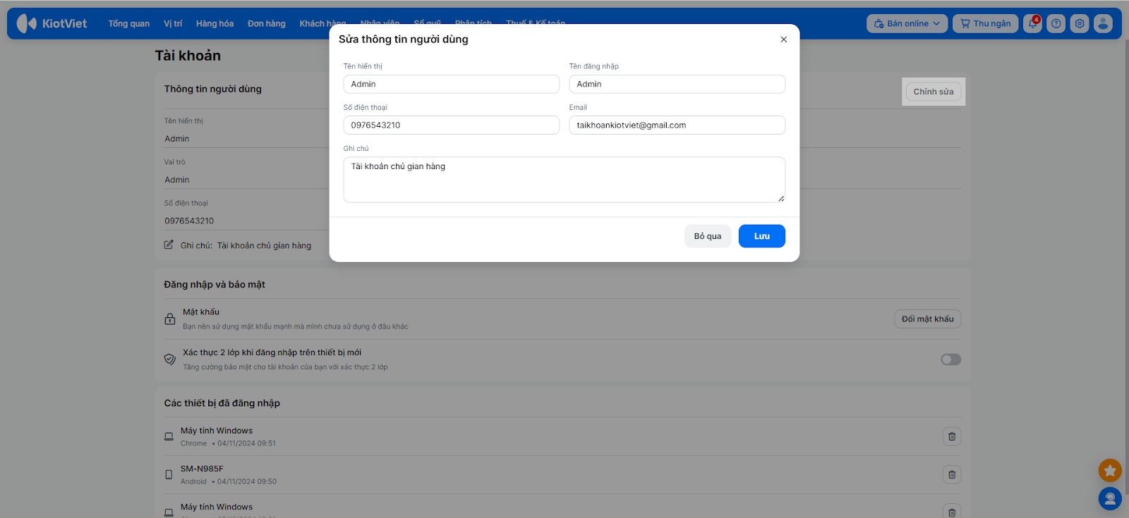 - Đối với tài khoản chủ gian hàng (Admin), bạn có thể xem thêm danh sách Các thiết bị đã đăng nhập để kiểm soát quyền truy cập.