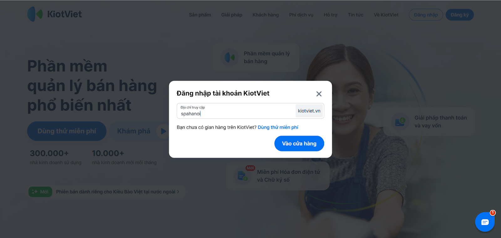 - Cách 1: Truy cập https://www.kiotviet.vn/, nhấn Đăng nhập góc phải màn hình → nhập tên gian hàng vào ô Địa chỉ truy cập → nhấn Vào Cửa Hàng.