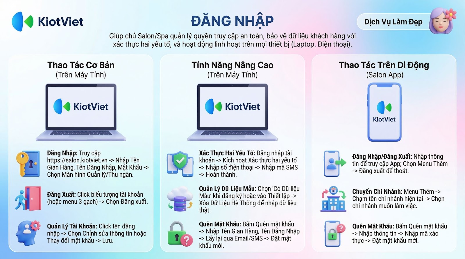Trên ứng dụng KiotViet Salon, bạn có thể thực hiện đầy đủ các nghiệp vụ liên quan đến tài khoản, bao gồm: đăng nhập, lấy lại mật khẩu, chuyển đổi giữa các chi nhánh, cũng như đăng xuất khỏi phần mềm.