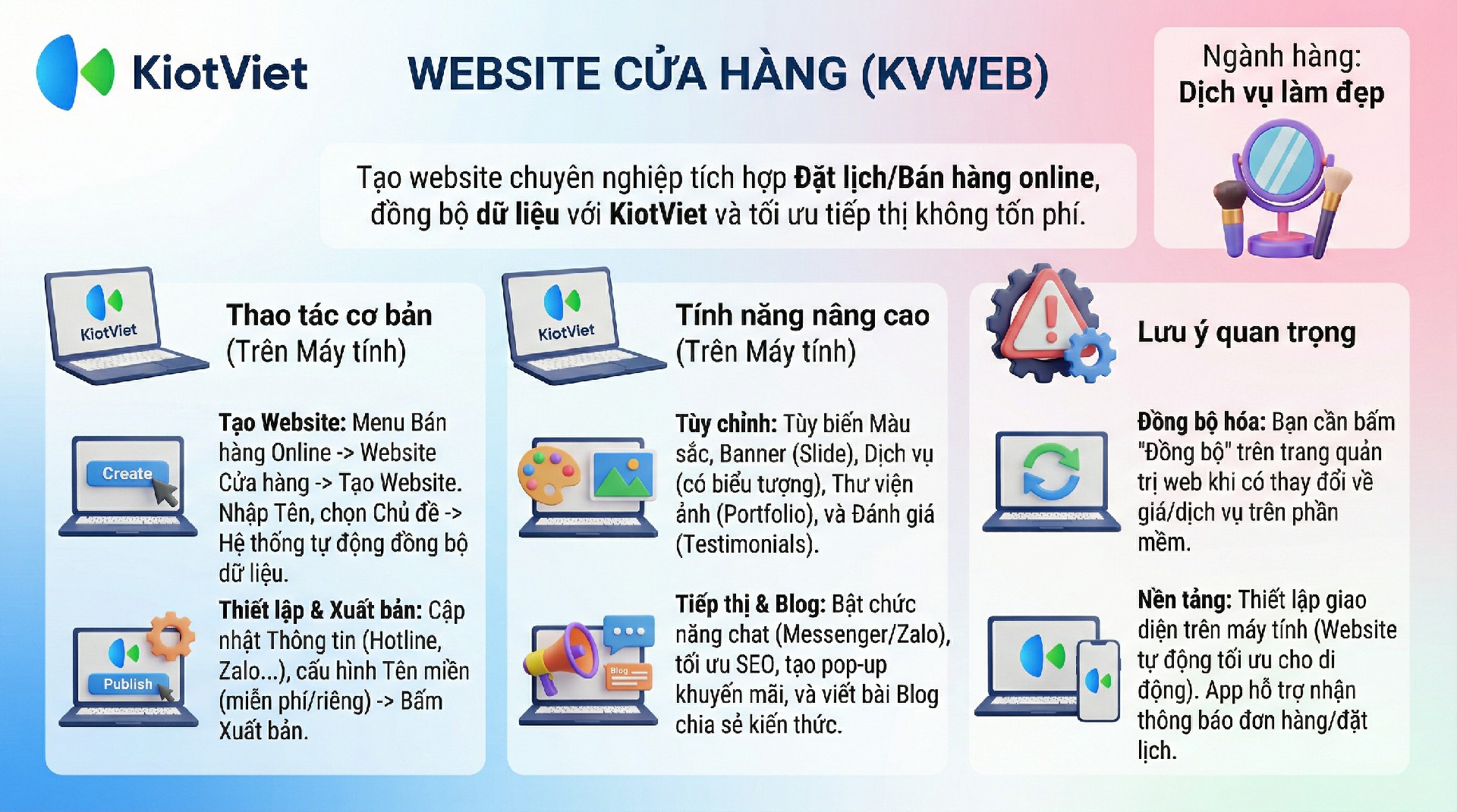 – Với KVWEB, chủ gian hàng không tốn chi phí phát triển bên ngoài đã có ngay 1 website đặt lịch và dễ dàng chia sẻ trang bán tới khách mua hàng.