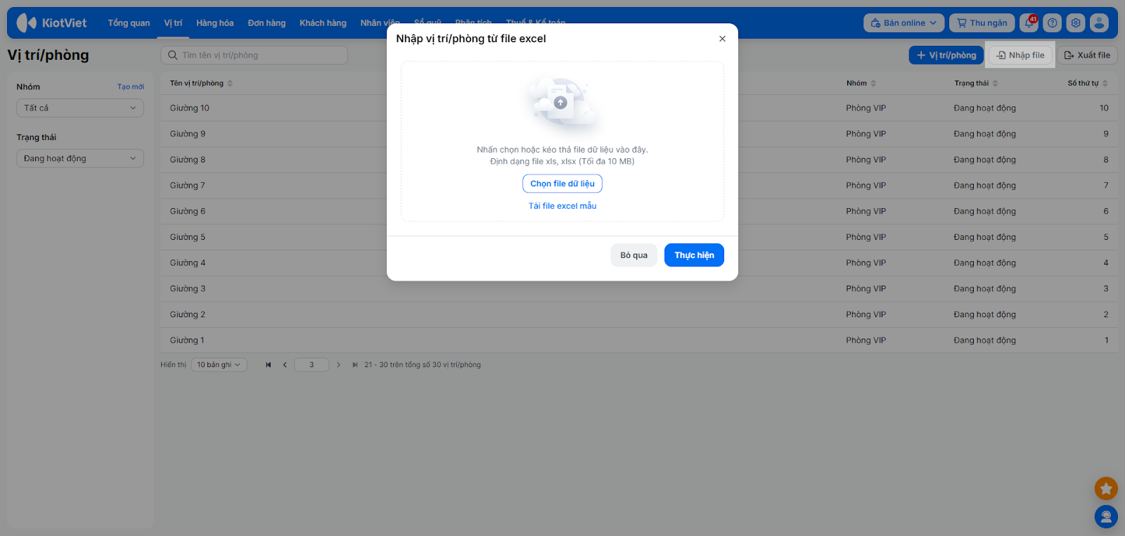 - Bạn có thể thao tác tương tự cho các vị trí khác hoặc nhập nhanh hơn qua file Excel theo mẫu bằng cách nhấn Nhập file → Chọn file dữ liệu → nhấn Thực hiện.