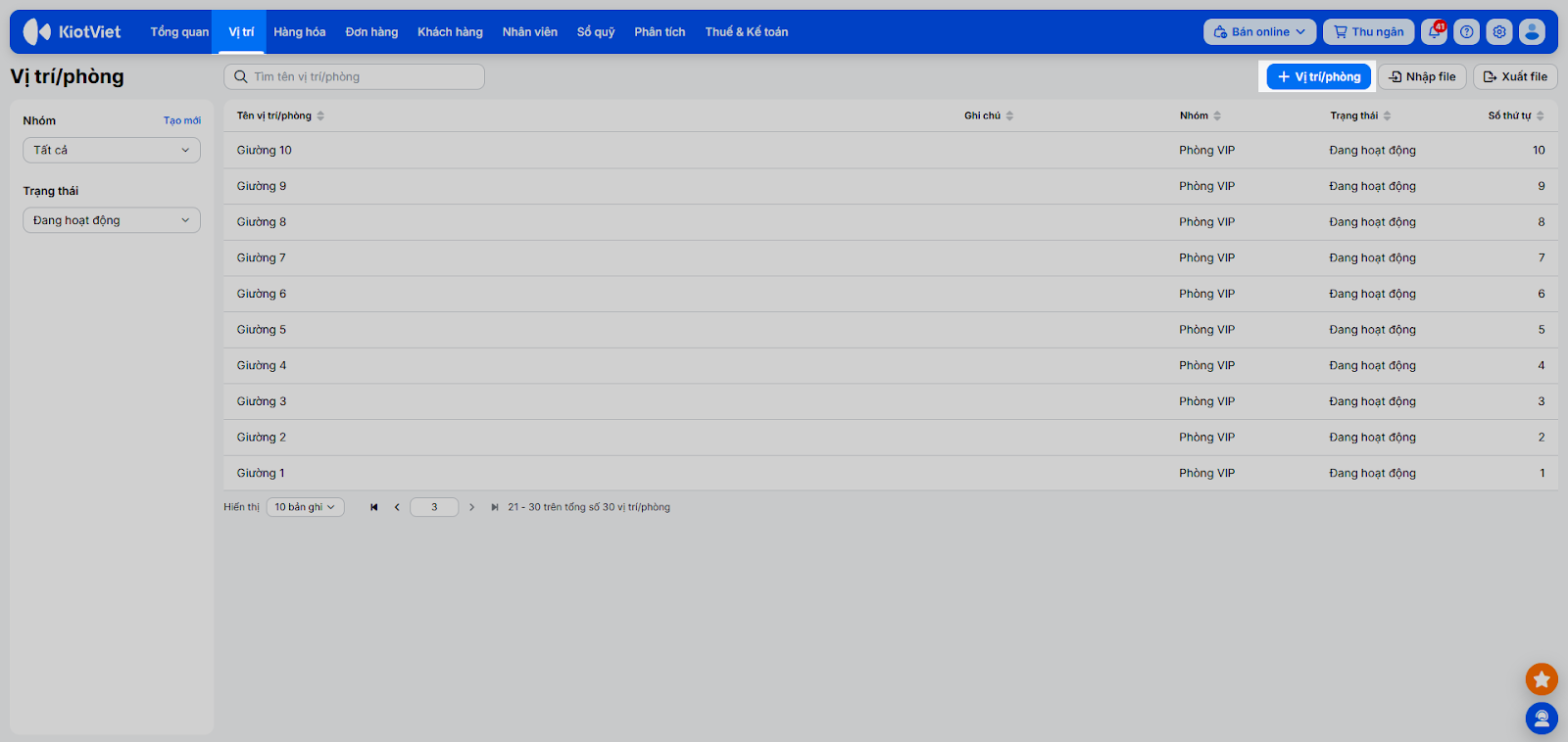 - Nhập Tên vị trí/phòng (ví dụ: VIP01) và Nhóm (ví dụ: Phòng VIP).