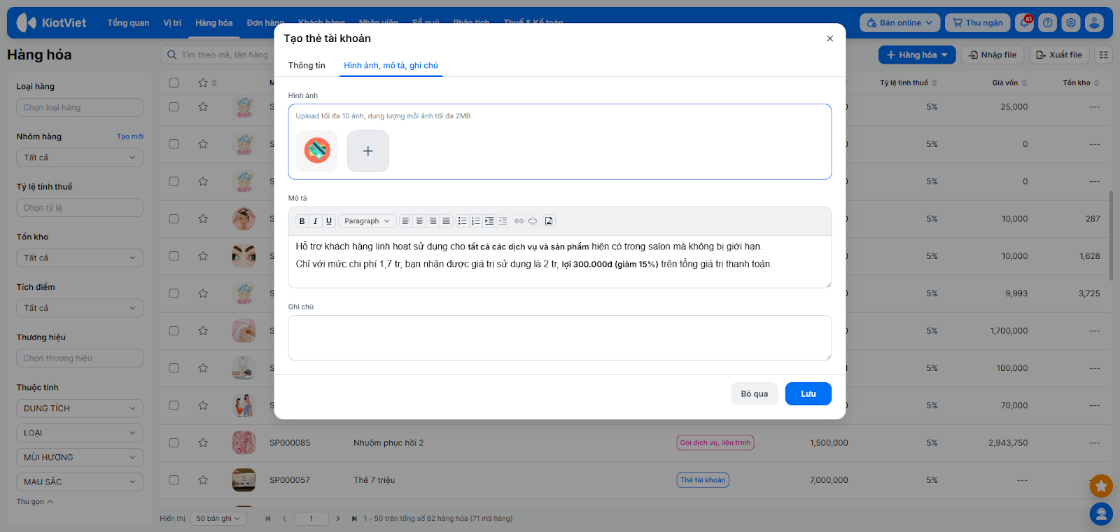 - Tùy biến linh hoạt: Hỗ trợ thiết lập thông tin chi tiết cho từng loại, bao gồm giá bán, giá vốn, tồn kho, thời lượng dịch vụ, nguyên liệu tiêu hao, và các điều kiện sử dụng gói/thẻ.