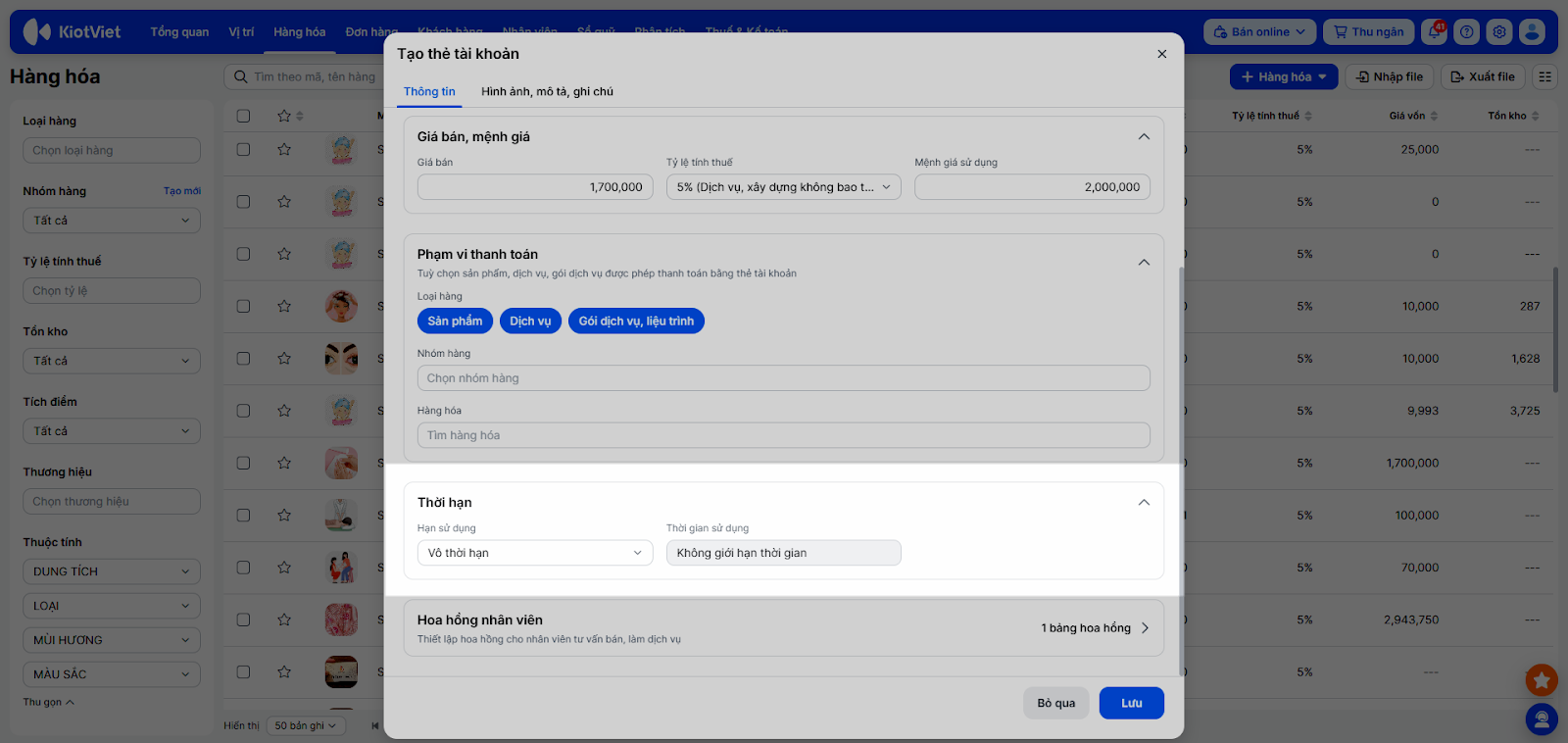 - Thời hạn: Thiết lập hạn sử dụng Vô thời hạn hoặc cụ thể (ví dụ: hết hạn vào ngày 31 tháng 12 năm 2025).