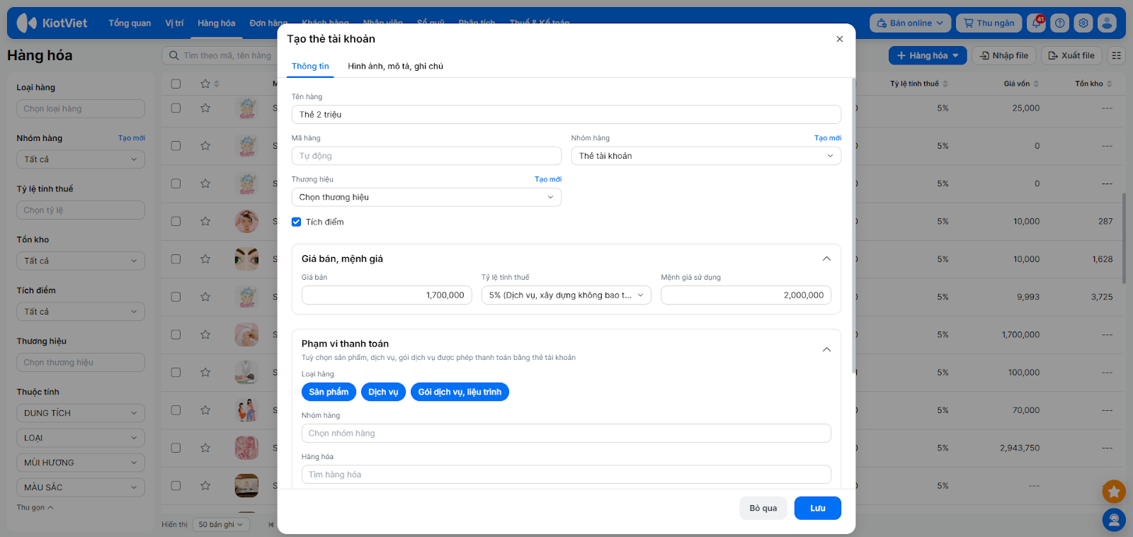 - Nhấn + Hàng hóa → chọn Thẻ tài khoản.