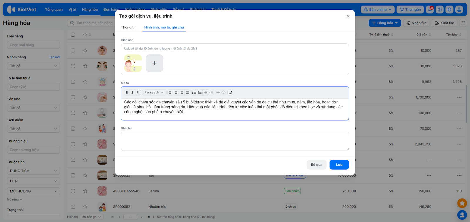- Tên liệu trình: Ví dụ: Gói liệu trình chăm sóc da chuyên sâu 5 buổi.