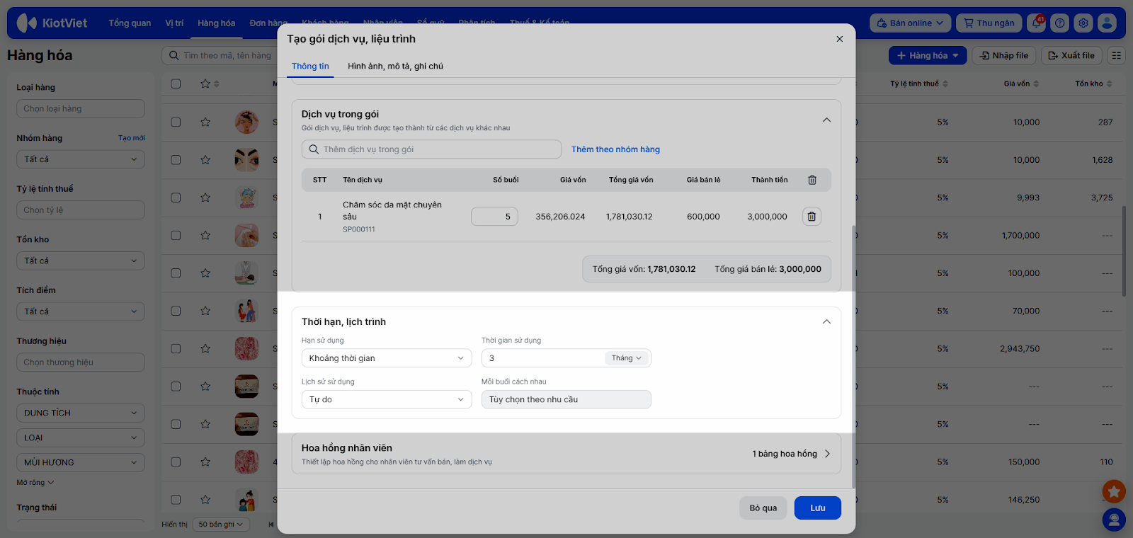 - Nhấn + Hàng hóa → chọn Gói dịch vụ, liệu trình.