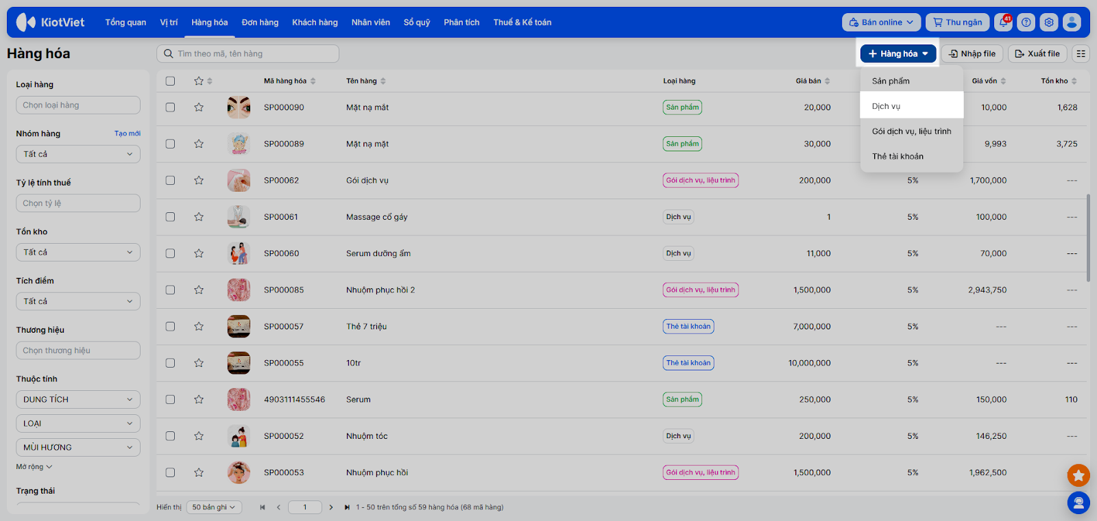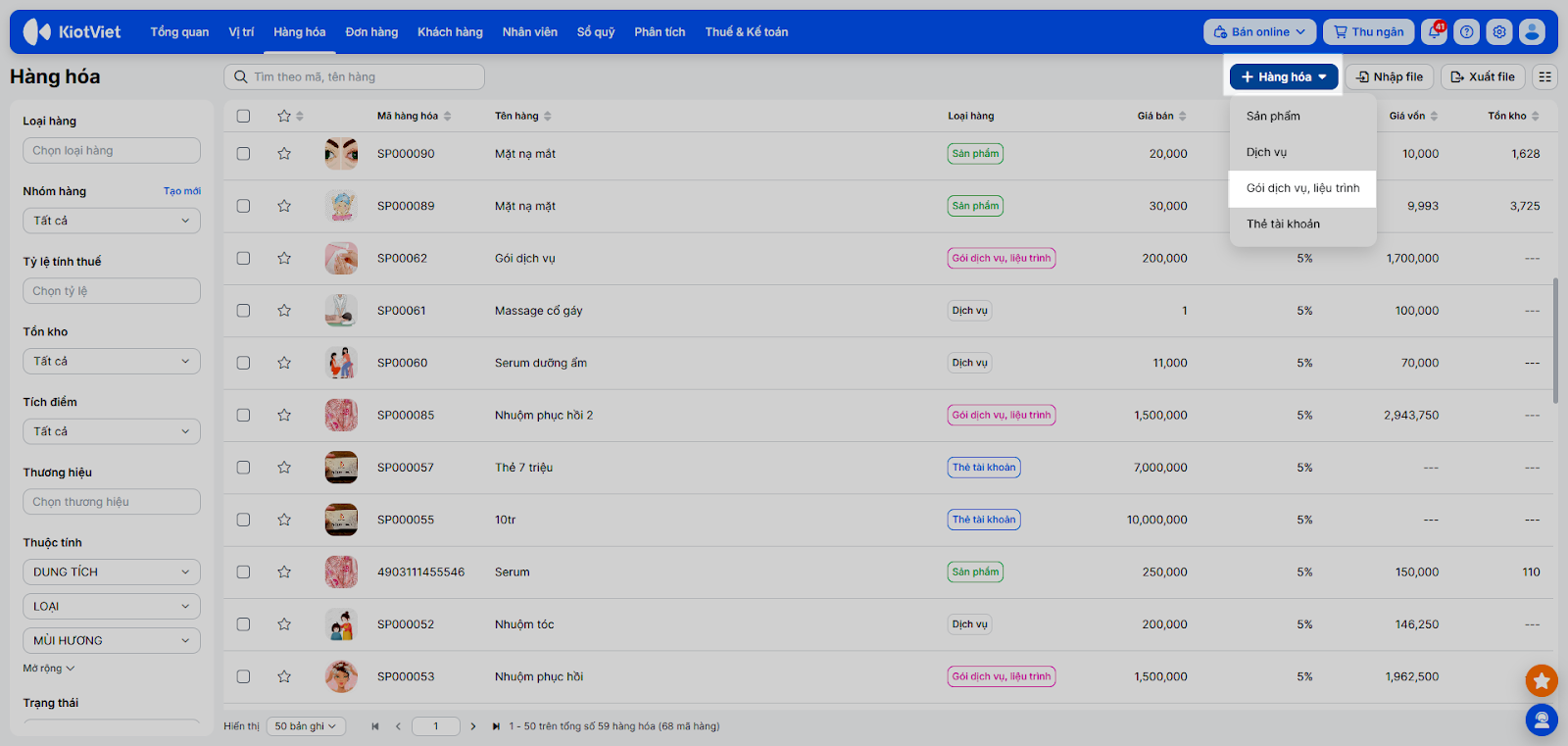 - Quản lý đa dạng dịch vụ/sản phẩm: Cho phép tạo và quản lý 4 loại mặt hàng chính: Hàng hóa thông thường, Dịch vụ, Gói dịch vụ/Liệu trình và Thẻ tài khoản.