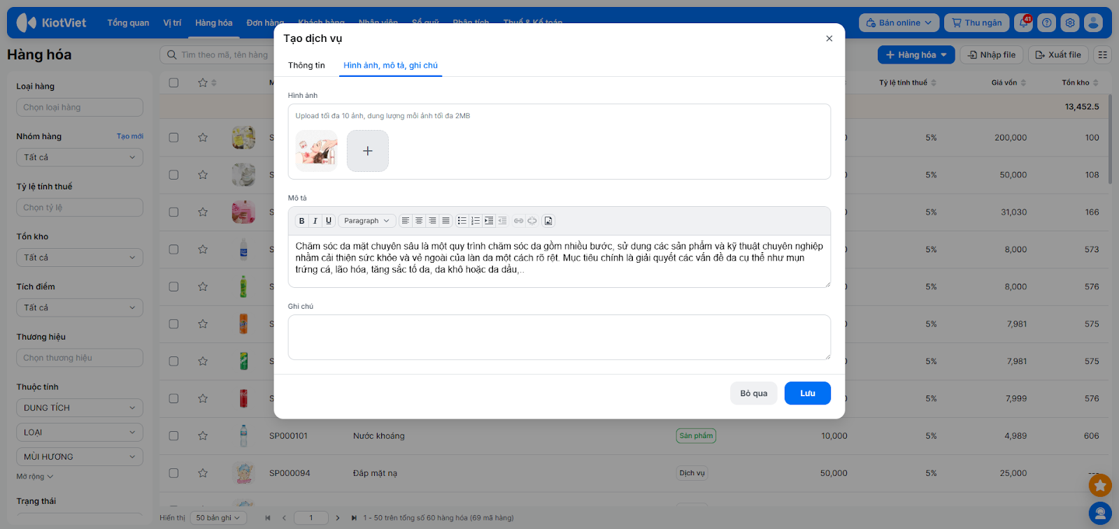 - Tình huống: Bạn muốn thêm một dịch vụ đặc trưng của salon/spa như “Chăm sóc da mặt chuyên sâu 90 phút” vào hệ thống.