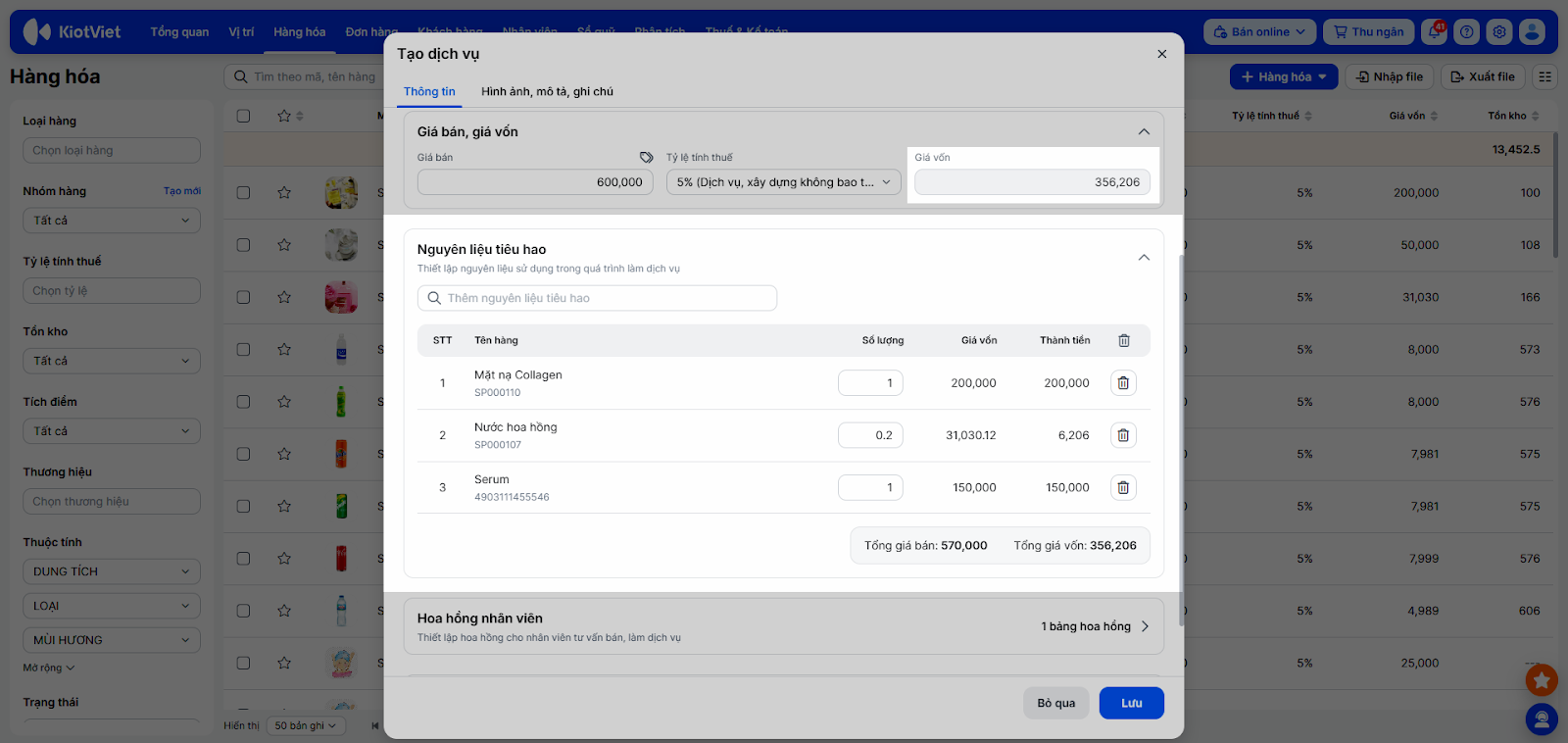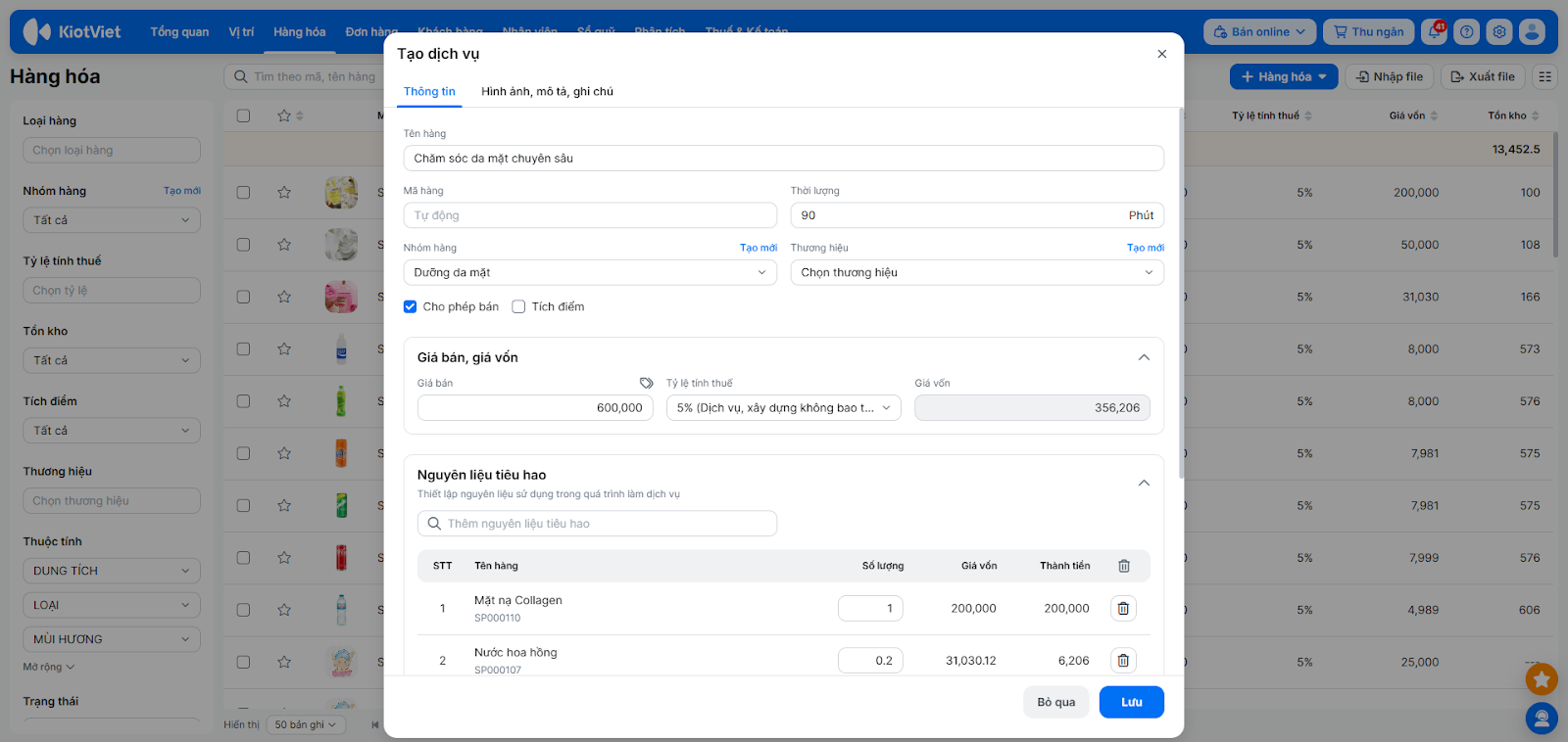 - Nguyên liệu tiêu hao: Chọn nguyên liệu tiêu hao cho dịch vụ (ví dụ: một mặt nạ dưỡng da giá vốn 200,000đ). Hệ thống sẽ tự động ghi nhận tổng giá vốn của nguyên liệu tiêu hao là giá vốn hàng dịch vụ.