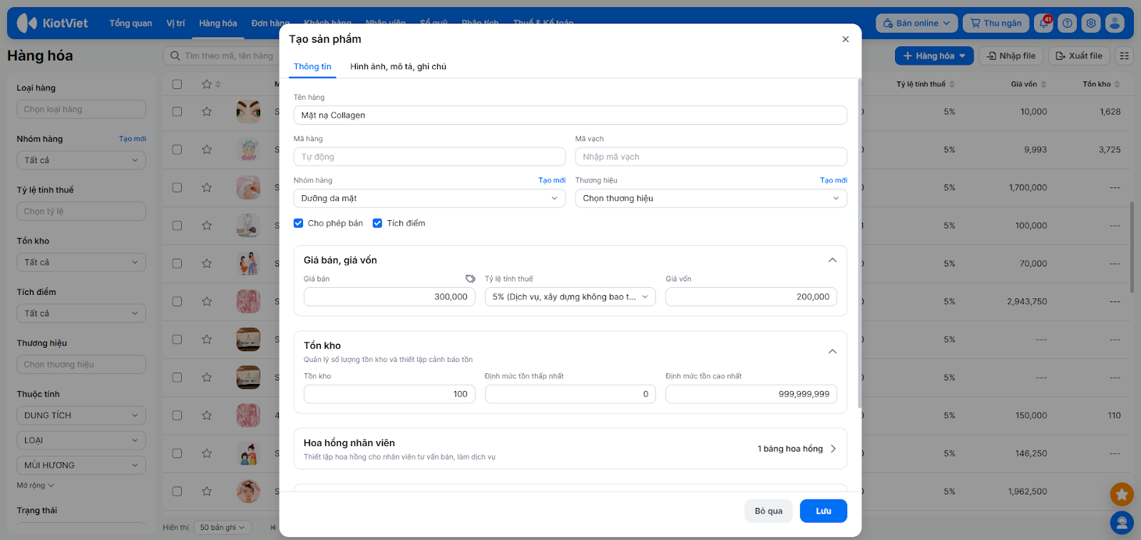- Tình huống: Bạn cần thêm một sản phẩm mỹ phẩm dùng để bán lẻ như “Mặt nạ Collagen” vào hệ thống KiotViet Salon.