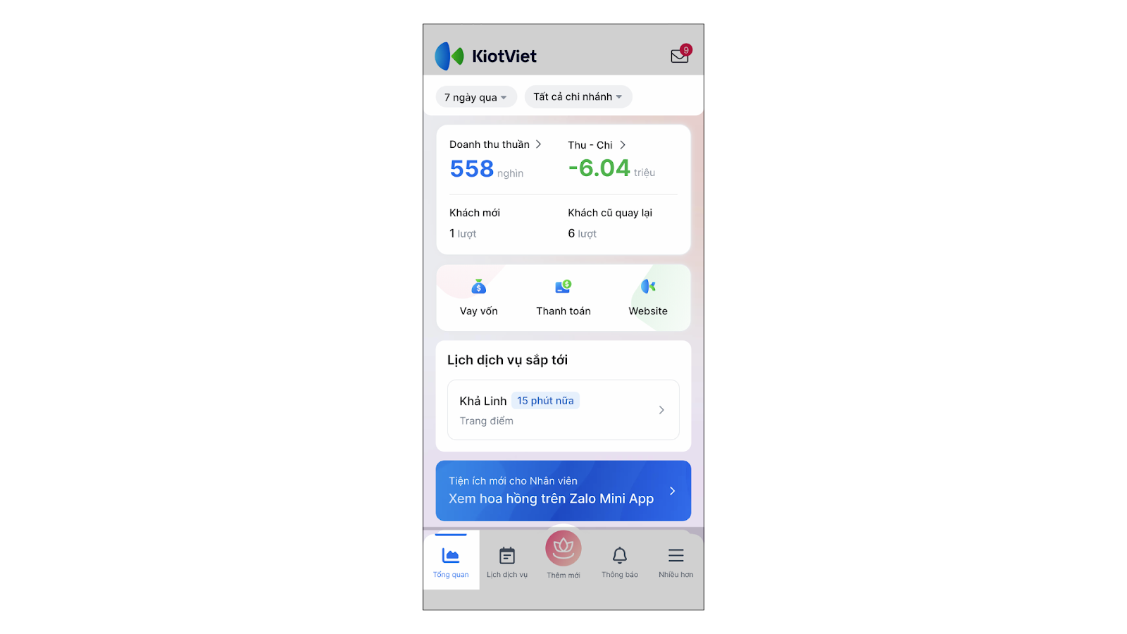 - Tình huống: Bạn là chủ salon/spa muốn nhanh chóng nắm bắt tình hình kinh doanh tổng thể của cửa hàng ngay trên điện thoại di động.