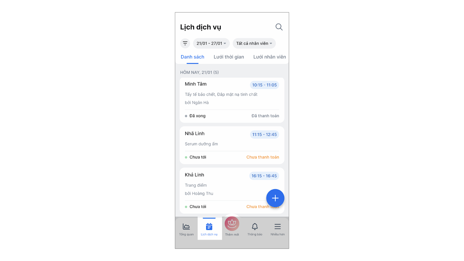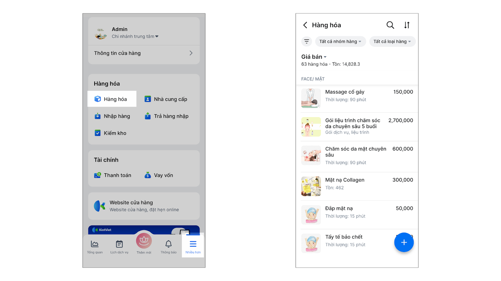 - Quản lý toàn diện các nghiệp vụ: Hỗ trợ xem tổng quan, quản lý hàng hóa, dịch vụ, gói liệu trình, thẻ tài khoản, cũng như lịch hẹn của khách hàng.