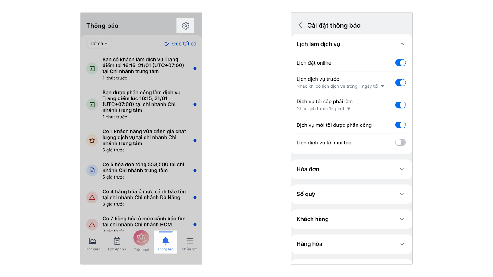 - Tình huống: Bạn muốn nhận các thông báo kịp thời để vận hành salon/spa hiệu quả hơn, đặc biệt với khách đặt lịch online hoặc các thông tin chăm sóc khách hàng, nhắc nhở về lịch dịch vụ trong ngày hoặc khi có một dịch vụ mới được phân công để không bỏ lỡ công việc