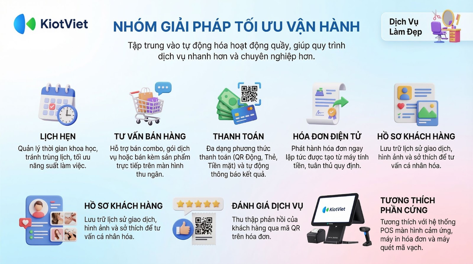 Nhóm giải pháp này tập trung vào việc tự động hóa các thao tác tại quầy, giúp quy trình phục vụ diễn ra nhanh chóng và chuyên nghiệp.