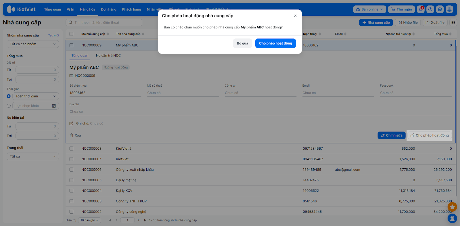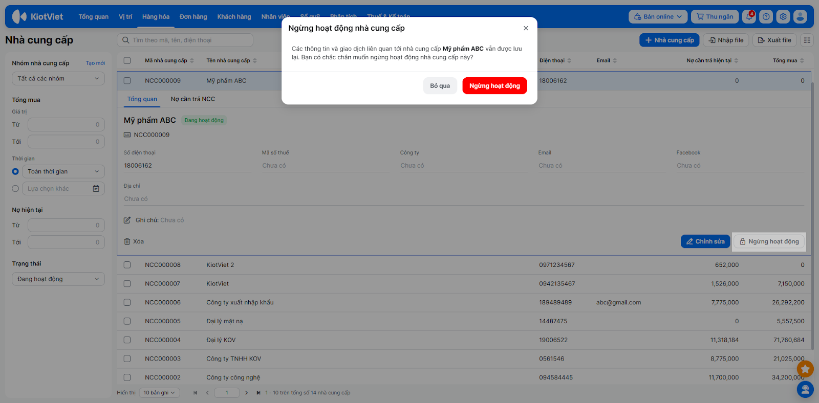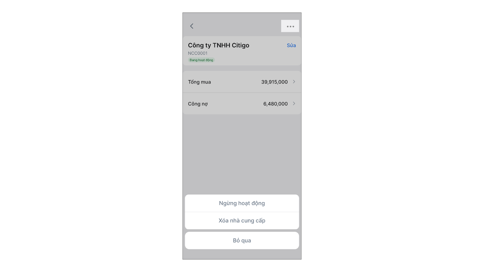 - Chọn 3 chấm nếu cần Ngừng hoạt động hoặc Xóa nhà cung cấp.