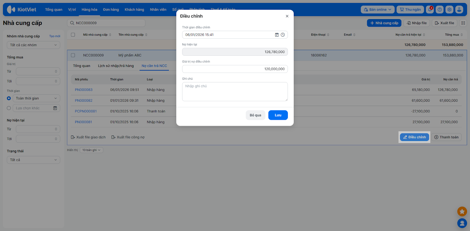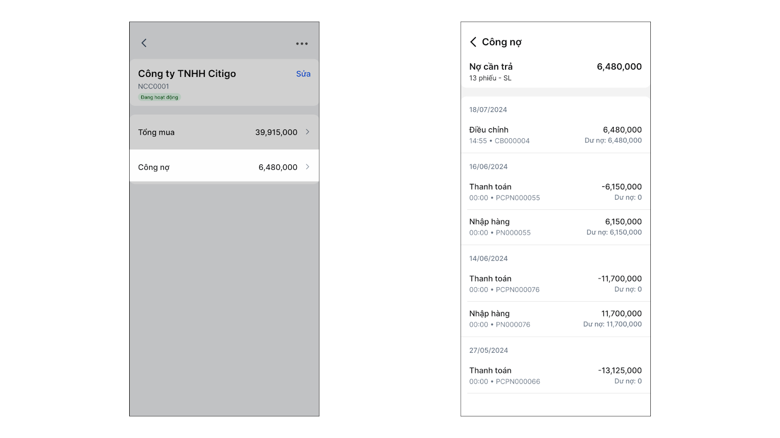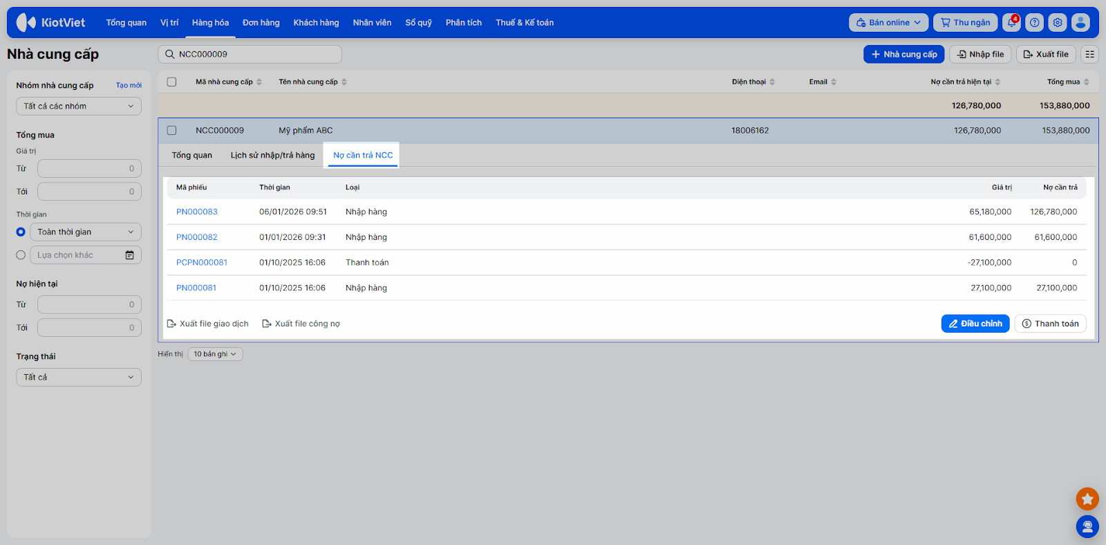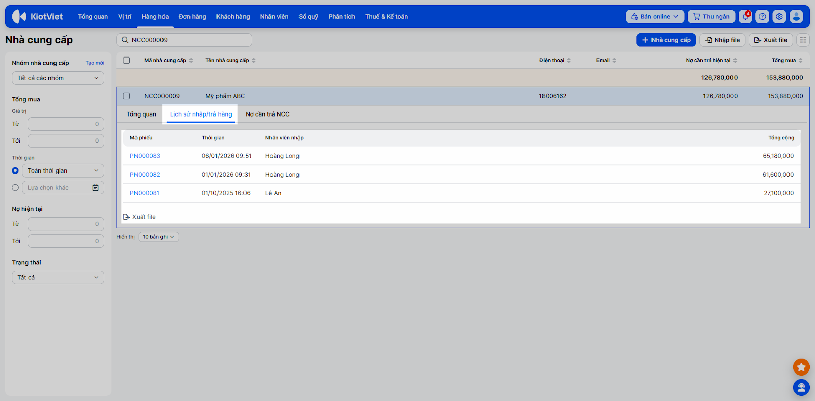 - Hệ thống liệt kê các giao dịch nhập/trả hàng và phiếu thanh toán với nhà cung cấp.
