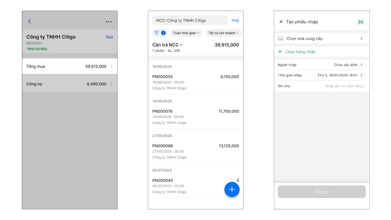 - Chọn Tổng mua: Xem lại các phiếu nhập hàng với nhà cung cấp. Tại đây, bạn có thể nhấn dấu + để thêm nhanh phiếu nhập hàng mới.