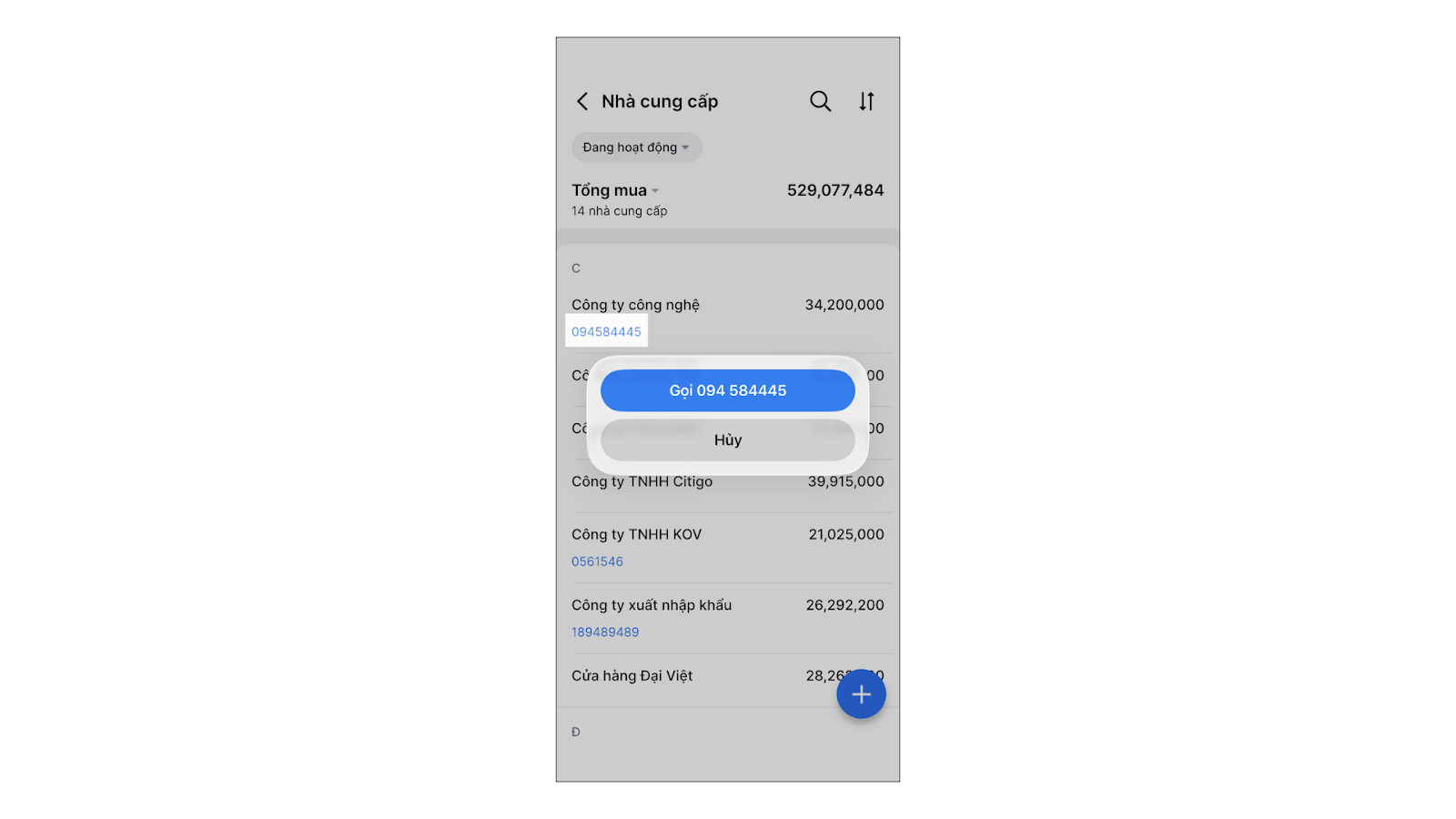 - Gọi điện nhanh: Chạm vào biểu tượng điện thoại để gọi ngay cho đối tác nhập hàng từ ứng dụng.