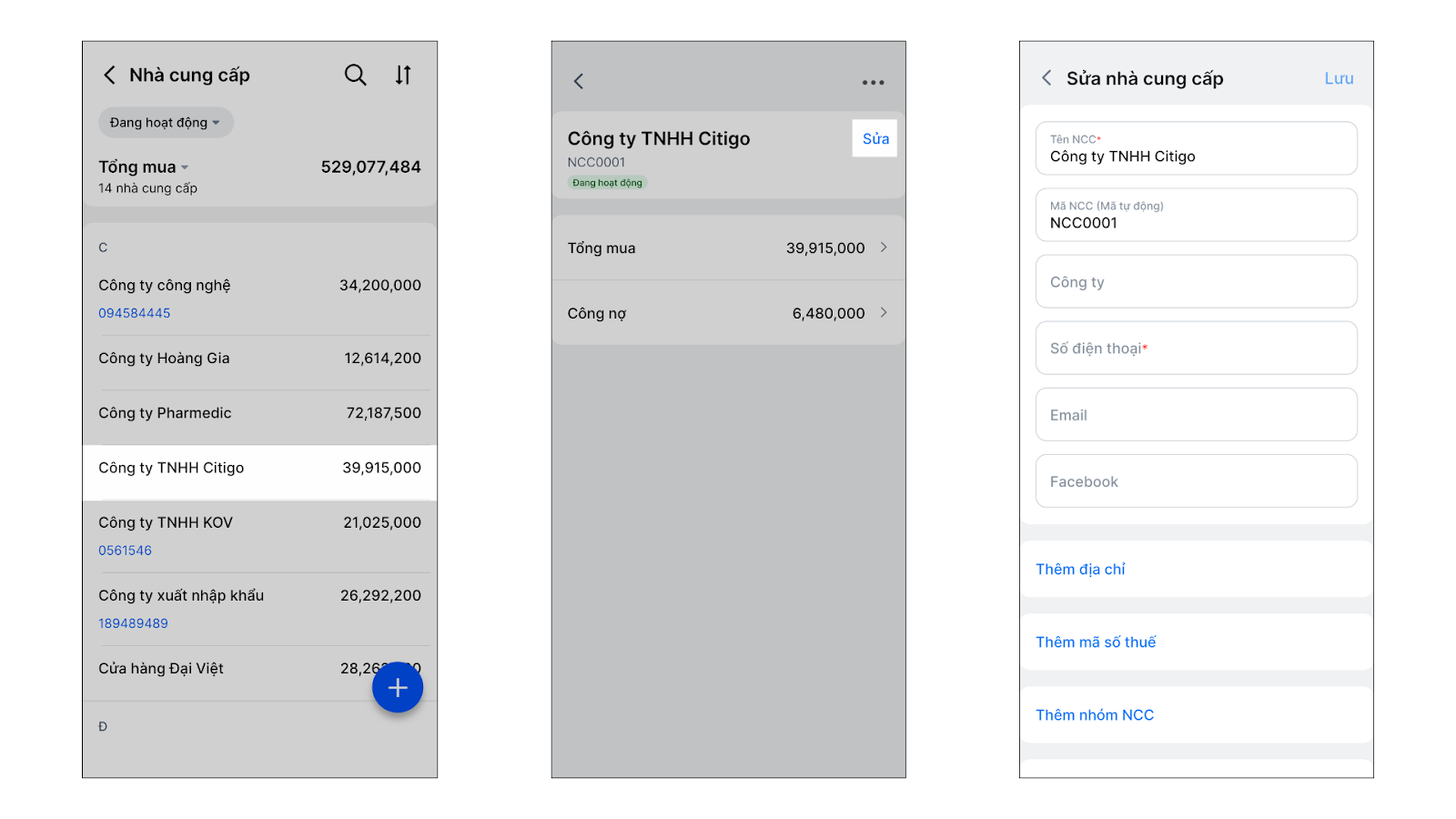 - Cập nhật: Chạm vào tên nhà cung cấp → chạm Sửa để thay đổi thông tin → nhấn Lưu.