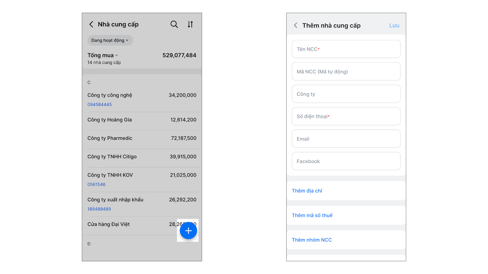 - Tạo mới: Chạm dấu (+) góc phải → nhập thông tin bắt buộc có dấu sao: Tên NCC, Số điện thoại → nhấn Lưu.