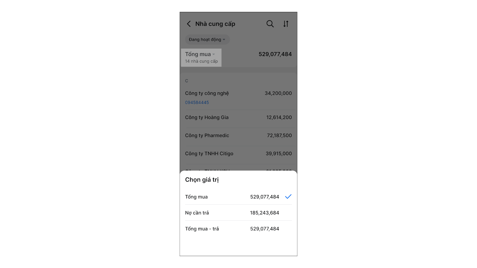 - Tình huống: Bạn muốn xem nhanh tổng số tiền đang nợ nhà cung cấp ngay trên điện thoại để chuẩn bị tiền thanh toán.