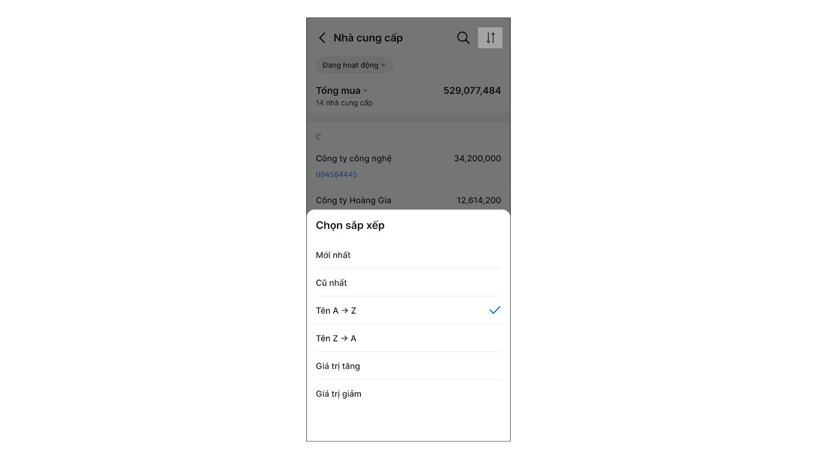 - Để sắp xếp thứ tự hiển thị các nhà cung cấp, bạn chọn biểu tượng mũi tên 2 chiều.
