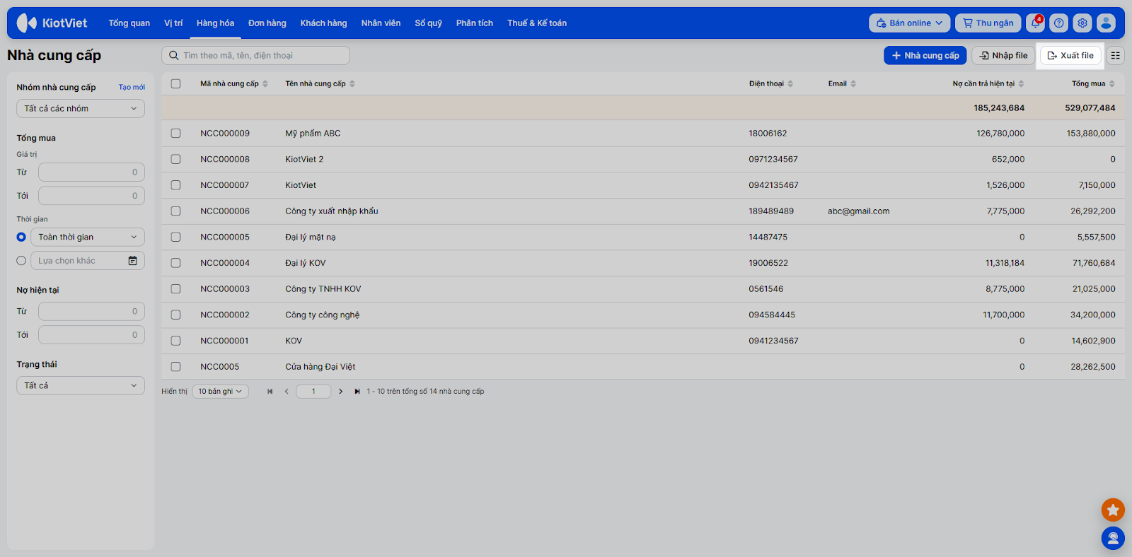 - Xuất file: Sử dụng chức năng Xuất file để xuất danh sách toàn bộ nhà cung cấp ra Excel để lưu trữ hoặc báo cáo.