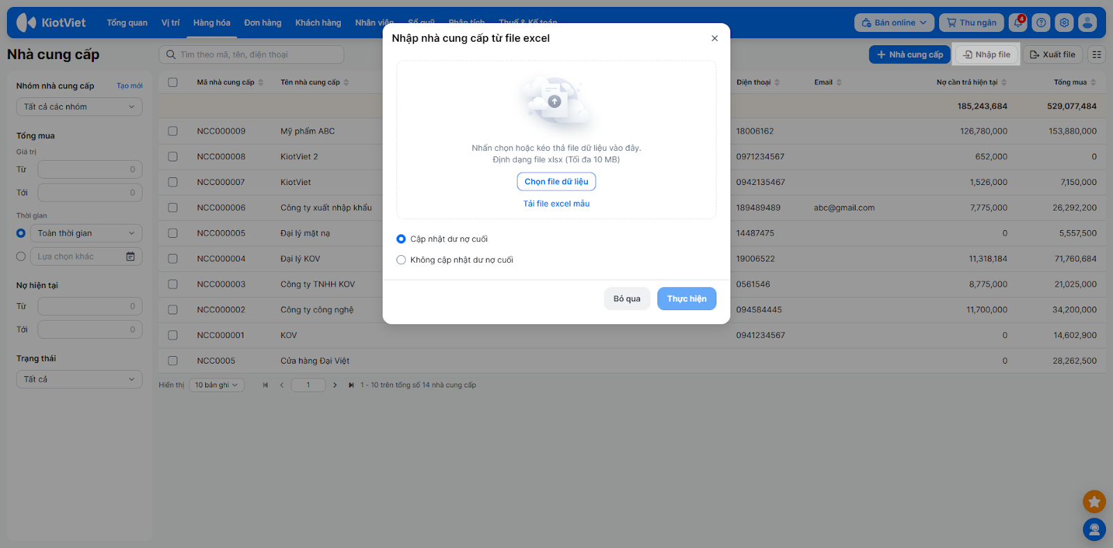 - Nhập file: Vào menu Nhà cung cấp → chọn Nhập file để thêm hàng loạt nhà cung cấp từ file Excel có sẵn theo mẫu của hệ thống. Bạn nhấn Chọn file dữ liệu → chọn Cập nhật dư nợ cuối hoặc không → nhấn Thực hiện.