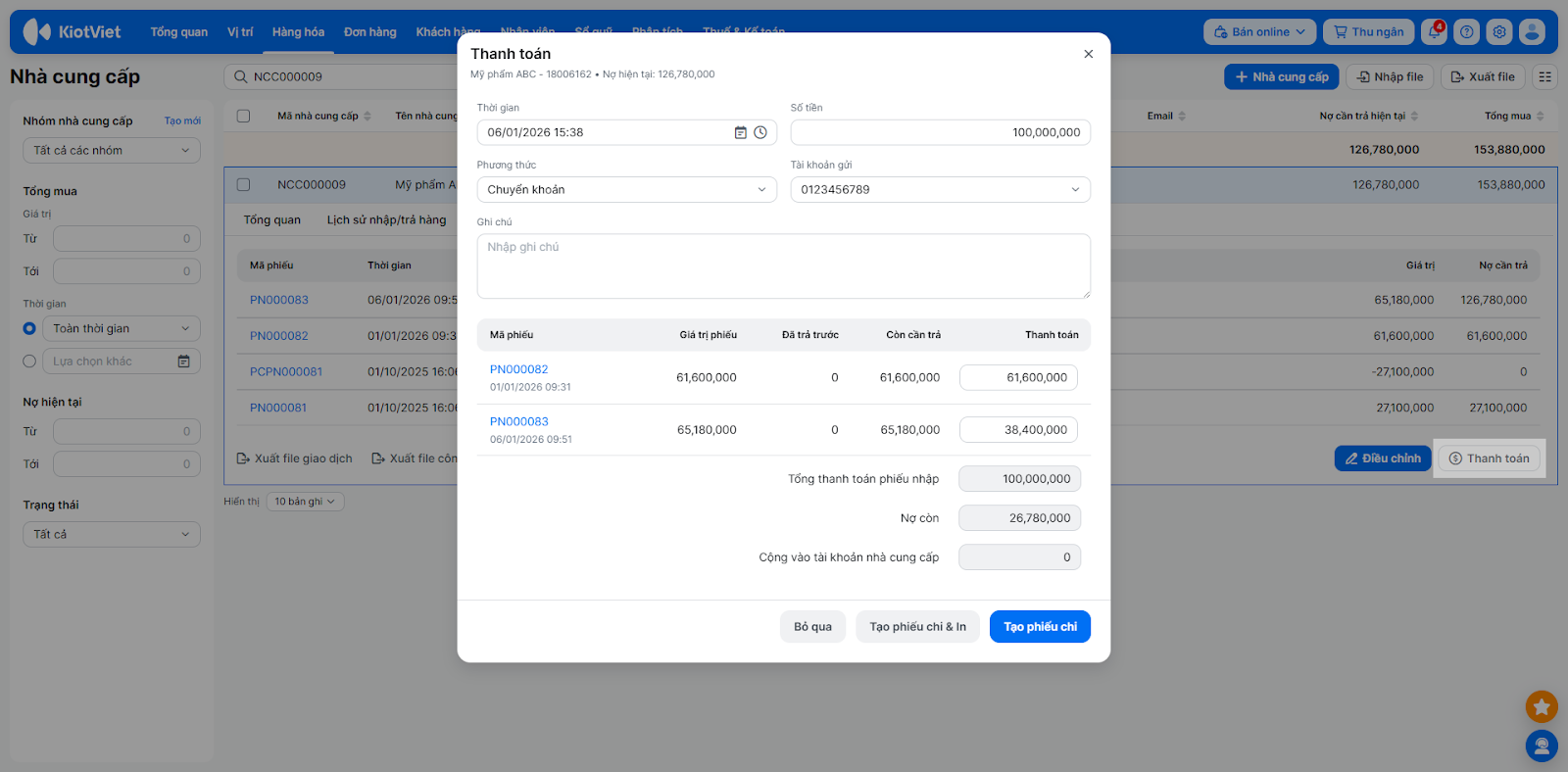 - Nhập Số tiền trả nhà cung cấp.