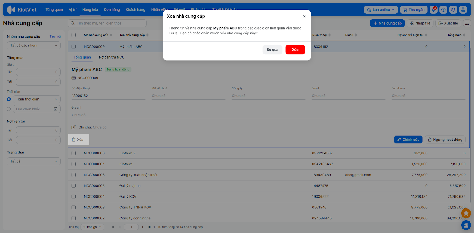 - Chọn Nhà cung cấp cần xóa.