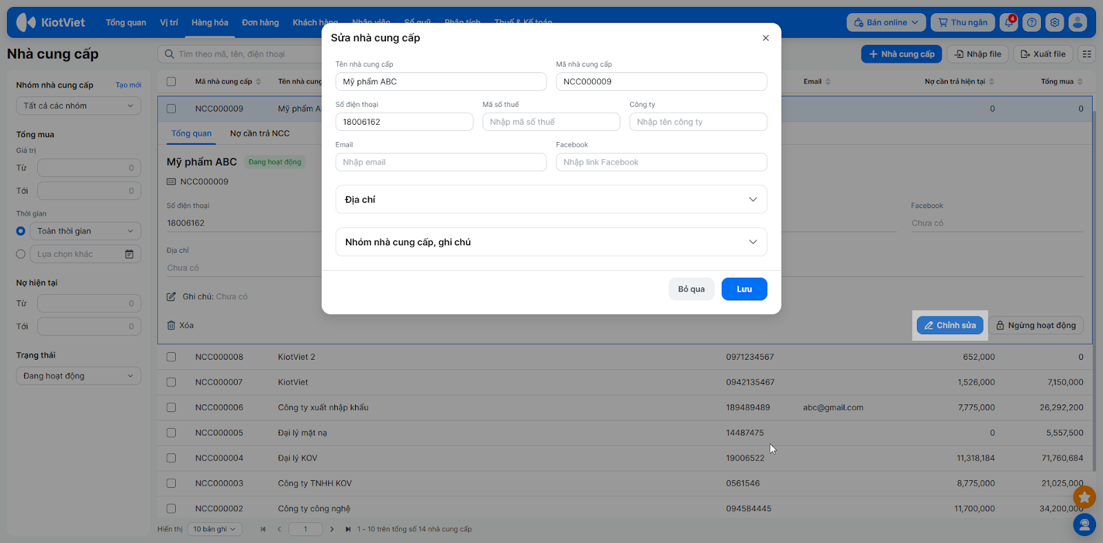 - Tìm kiếm và chọn nhà cung cấp cần sửa.