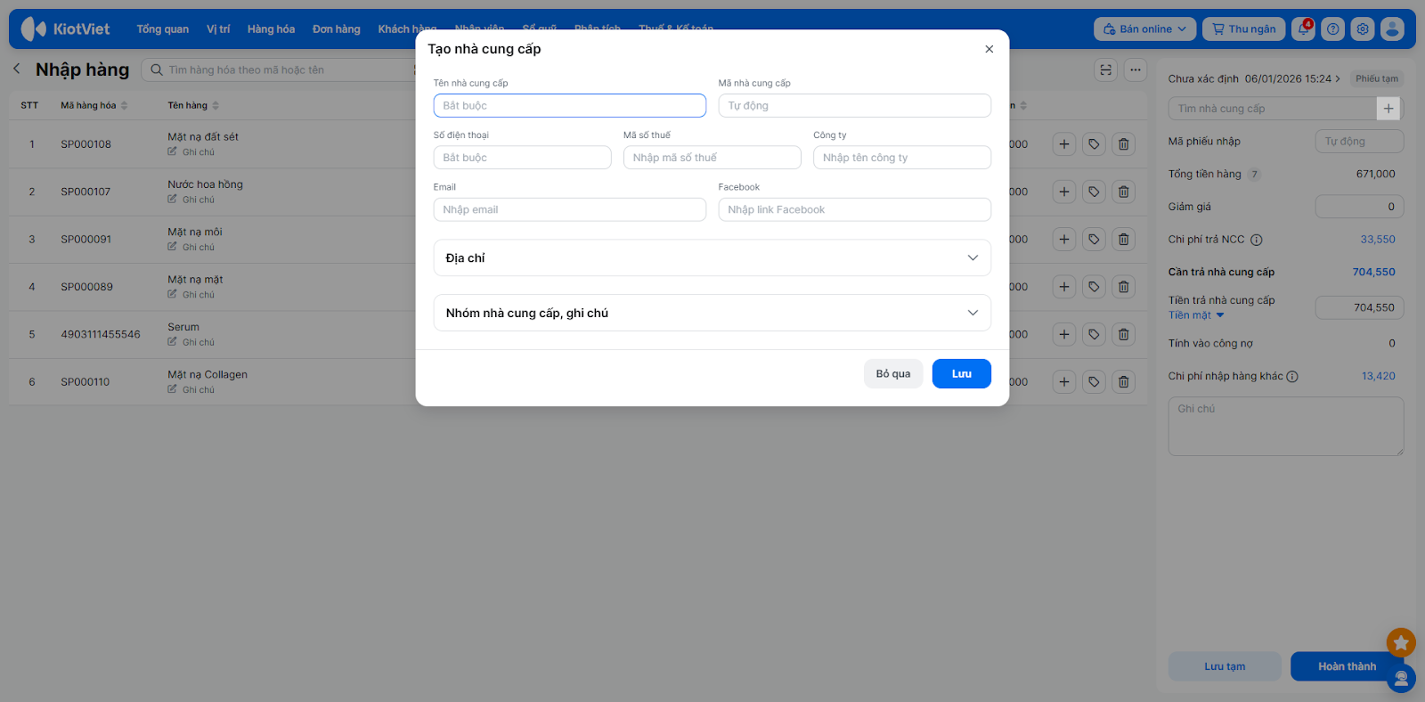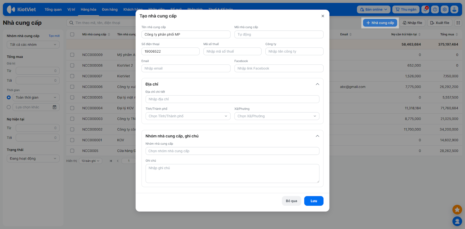 - Nhập các thông tin bắt buộc: Tên nhà cung cấp, Số điện thoại.