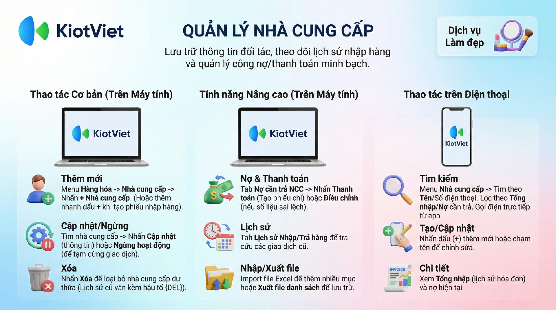 Trong kinh doanh Salon/Spa, việc quản lý Nhà cung cấp (đơn vị cung cấp mỹ phẩm, thuốc nhuộm, máy móc thiết bị…) là yếu tố then chốt để kiểm soát chi phí đầu vào và công nợ.