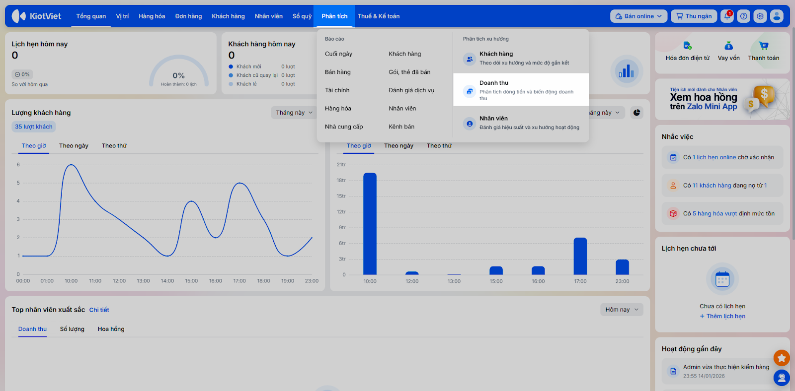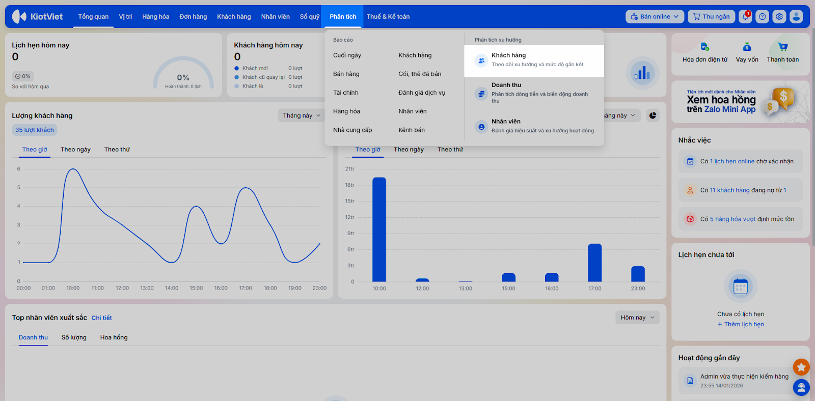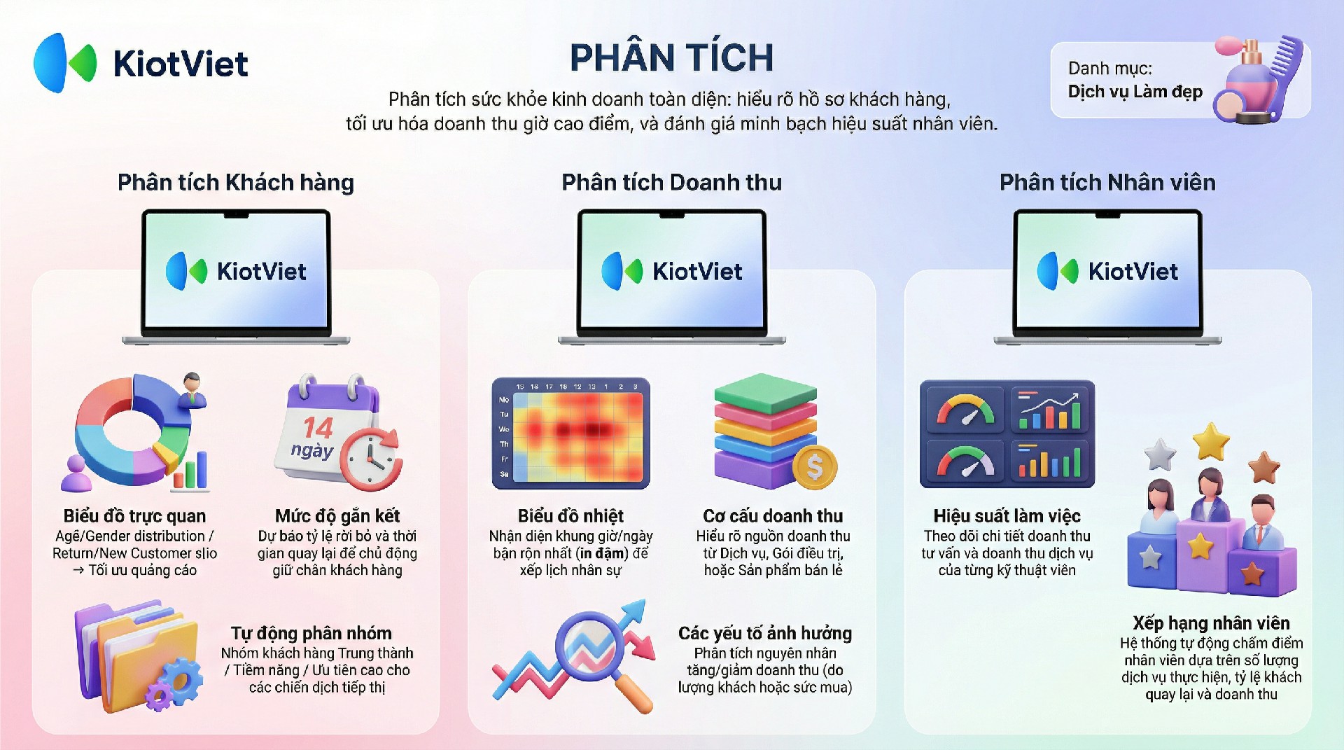 Tính năng Phân tích trên KiotViet là công cụ quản trị chuyên sâu, sử dụng trí tuệ nhân tạo (AI) và các thuật toán tiên tiến để cung cấp cho chủ Salon/Spa cái nhìn toàn diện về sức khỏe của doanh nghiệp. Tính năng này áp dụng cho các gói Dùng thử, Chuyên nghiệp và Cao cấp.
