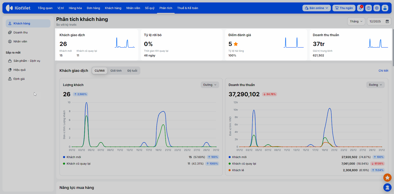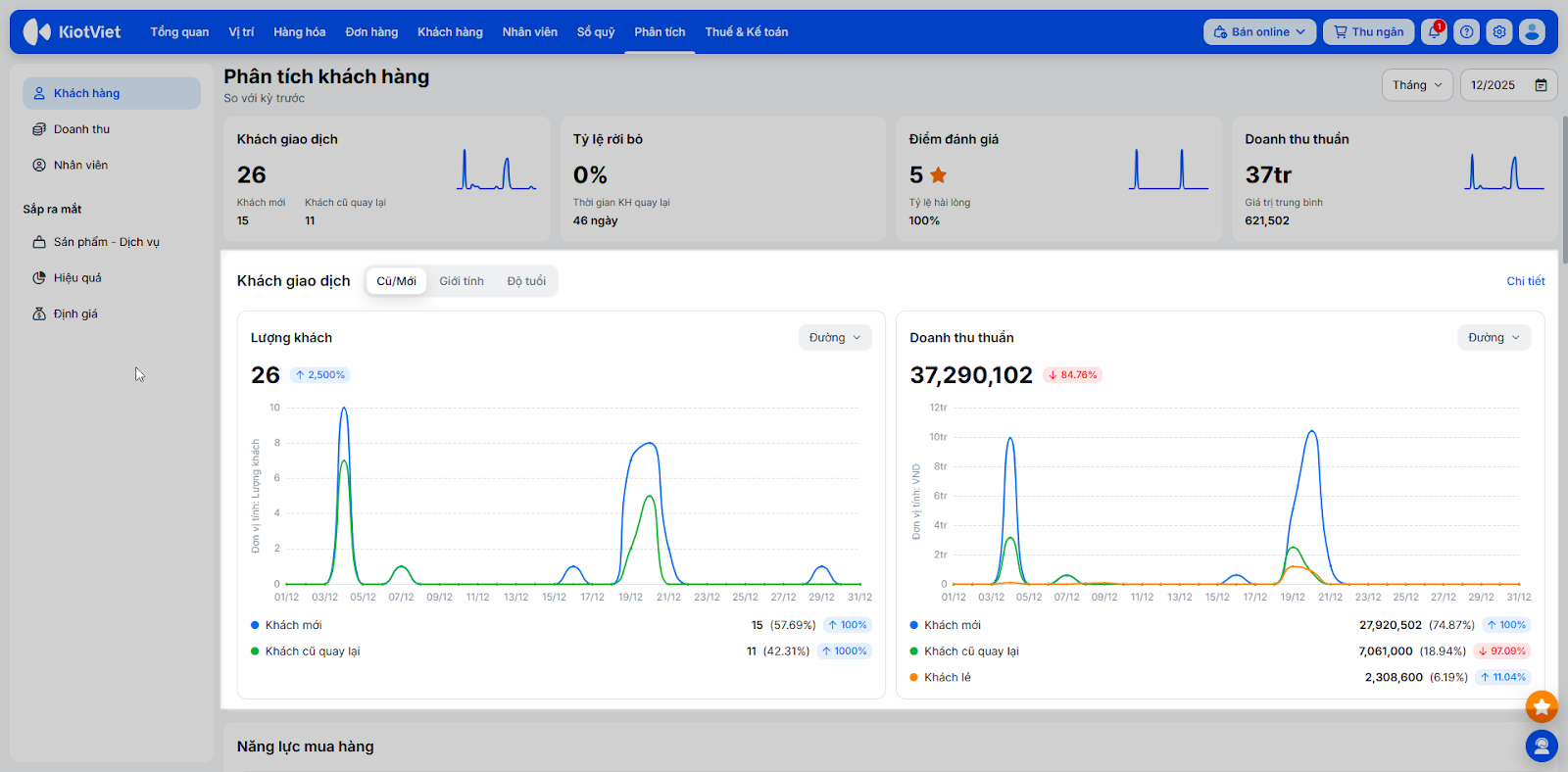 - Khách giao dịch: Tổng hợp số lượng Khách mới (tạo mới trong kỳ) và Khách cũ quay lại (đã có từ trước và quay lại phát sinh giao dịch trong kỳ).