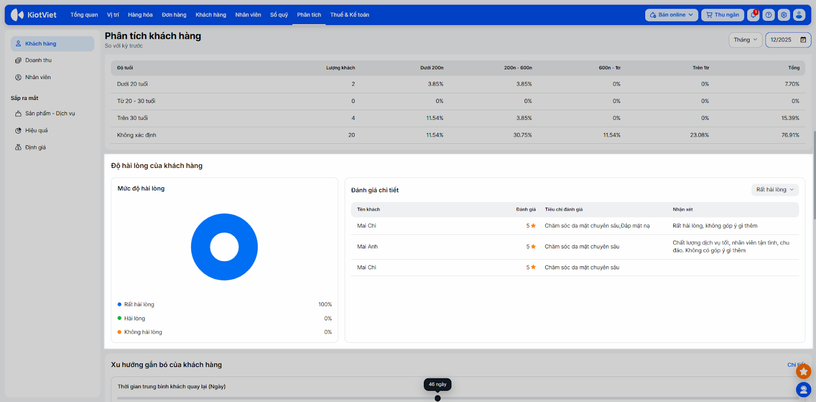 - Ví dụ: Salon trong ngày 25/12/2025 có 42 khách đến giao dịch và thời gian trung bình khách hàng quay lại là 7 ngày. Do đó, khách hàng này được dự đoán là sẽ quay lại trước ngày 01/01/2026