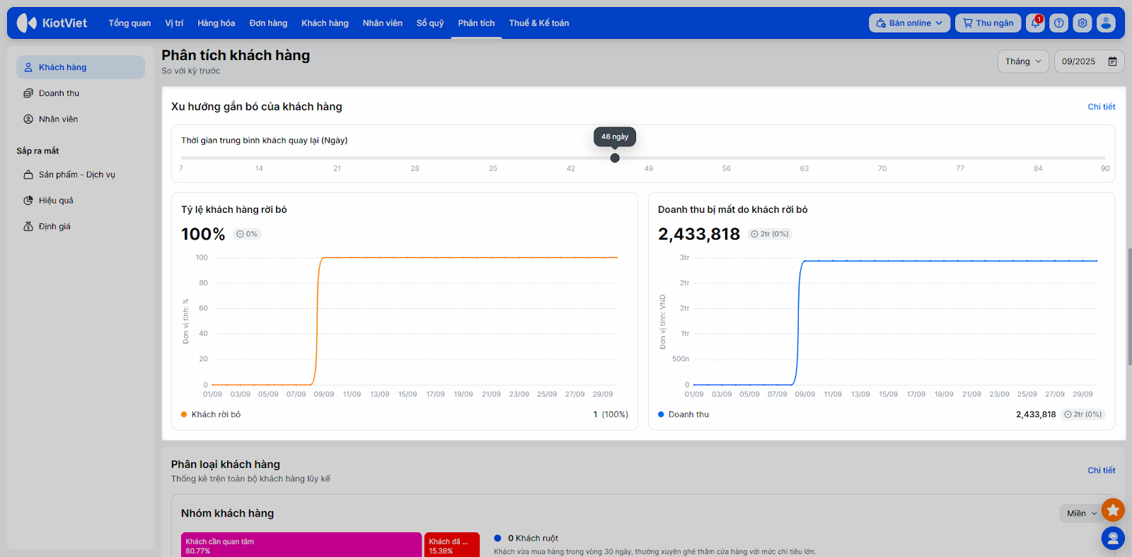 - Bạn có thể tùy chọn mốc thời gian phù hợp với nhu cầu, hệ thống sẽ tự động tính toán và thay đổi giá trị của 2 biểu đồ Tỷ lệ khách hàng rời bỏ và Doanh thu bị mất do khách rời bỏ.