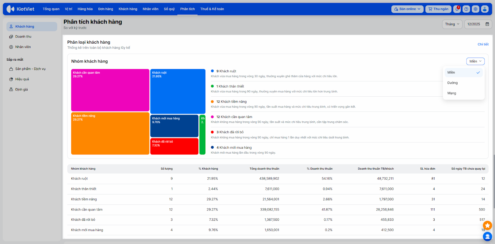 - Nhóm khách hàng: Khách ruột / Khách thân thiết / Khách tiềm năng / Khách cần quan tâm / Khách đã rời bỏ / Khách mới mua hàng.