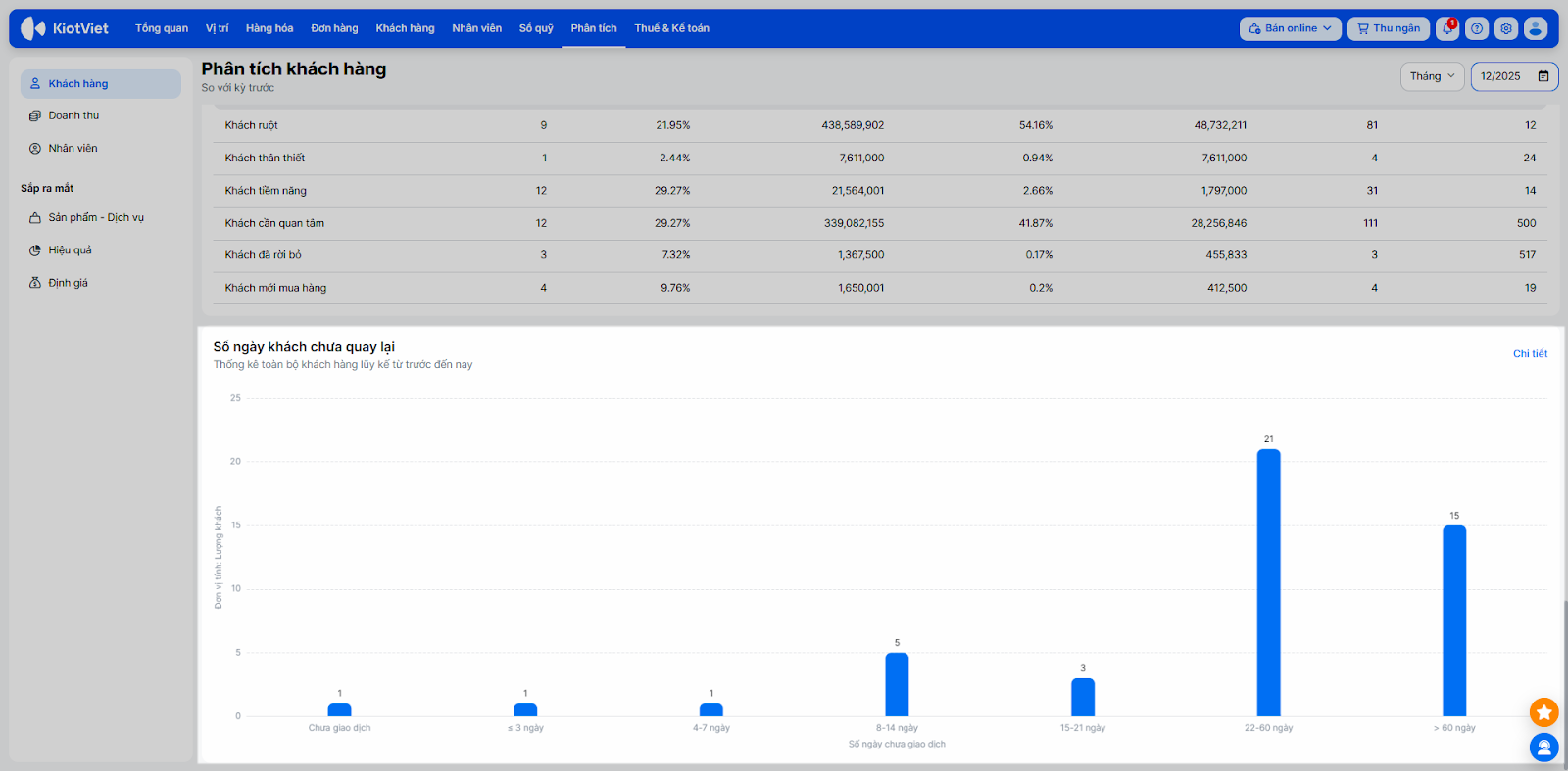 - Báo cáo cung cấp góc nhìn về số lượng khách hàng theo lần cuối giao dịch. Từ đó bạn có thể kiểm tra danh sách và đưa ra các quyết định về tiếp thị các khách hàng lâu rồi chưa quay trở lại.